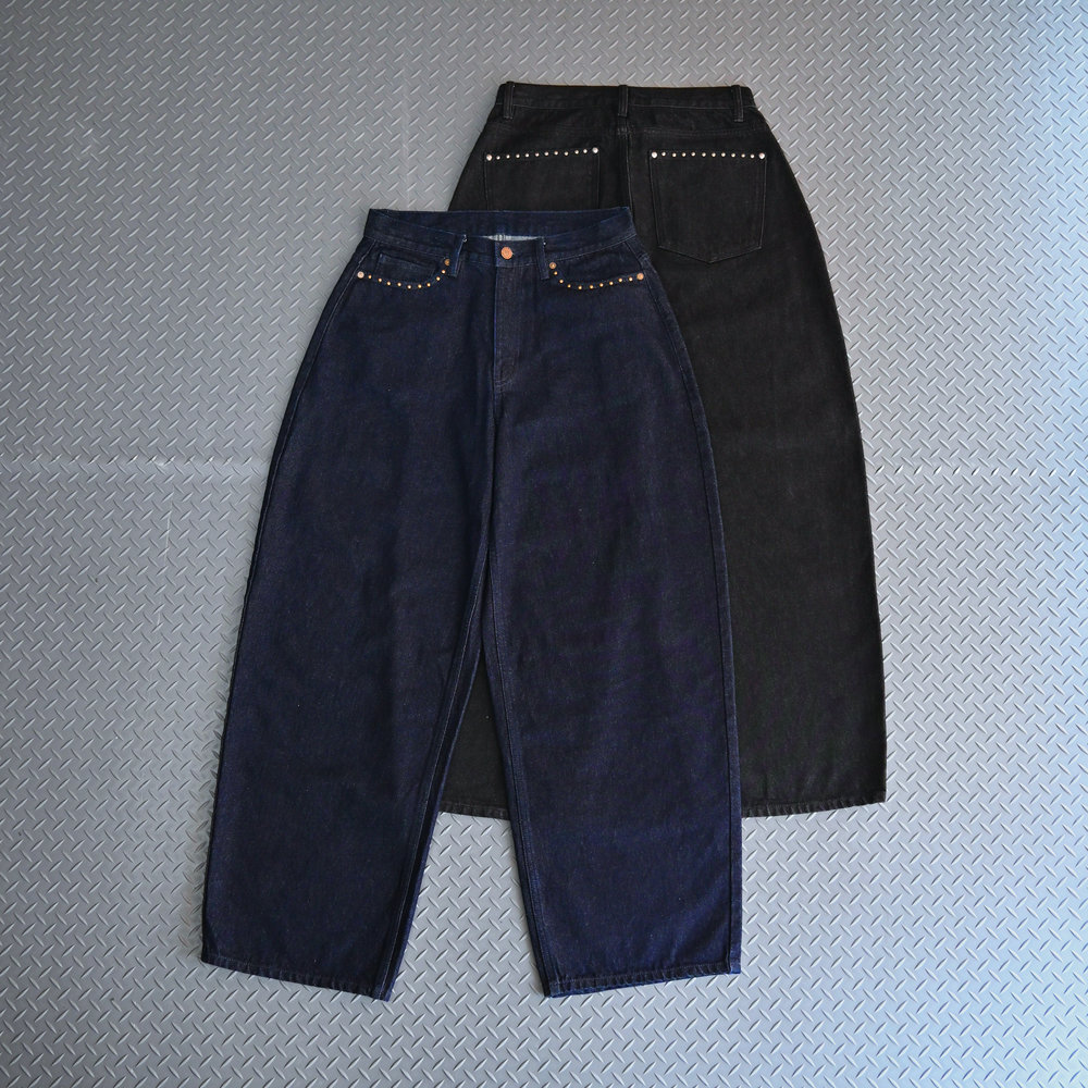 前後ポケットのみに施したスタッズ装飾は、存在感を放ちながらも全体のスタイリングを邪魔しない絶妙なバランスに。