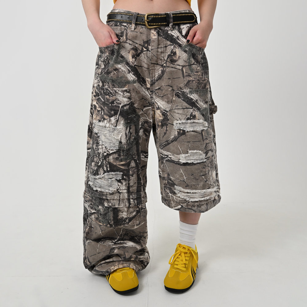トレンドのリアルツリー柄に、地底人ONLINEらしいダメージ加工をプラス。ヴィンテージ感のある風合いが、シンプルなトップスと合わせるだけでも”こなれた”雰囲気を演出。