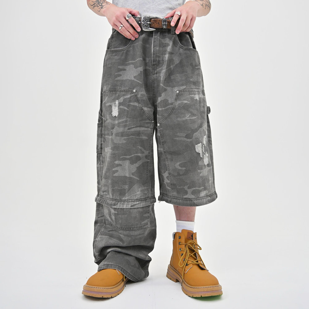 トレンドのカモ柄をベースに、地底人ONLINEらしく汚れ、ダメージ加工を随所にプラスした2WAYデニム