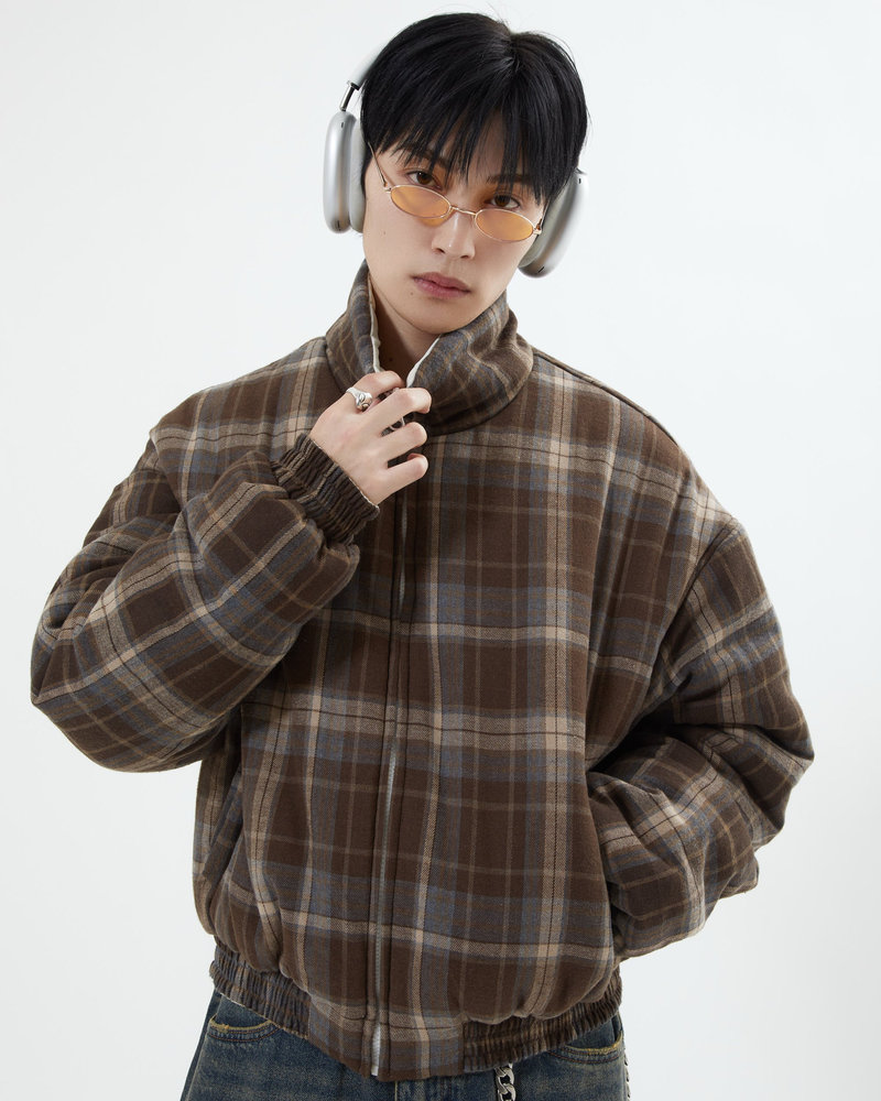 トレンドのチェック柄は、ヴィンテージを想起させる生地を厳選。片面はシンプルな無地カラーで、両面ともに着まわしやすい一着です。