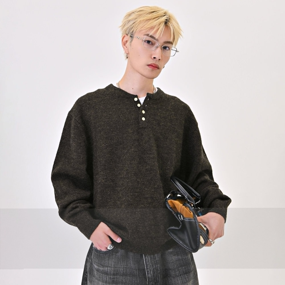 2色の糸を組み合わせたメランジニットに、トレンドのヘンリーネックデザインをプラス。