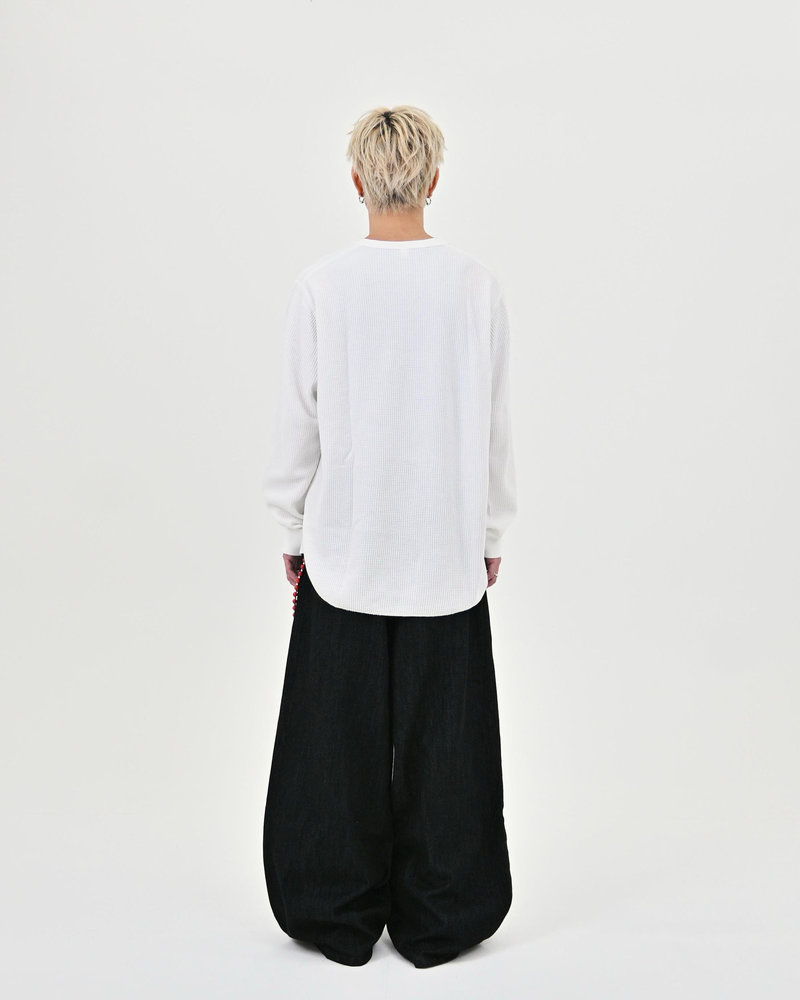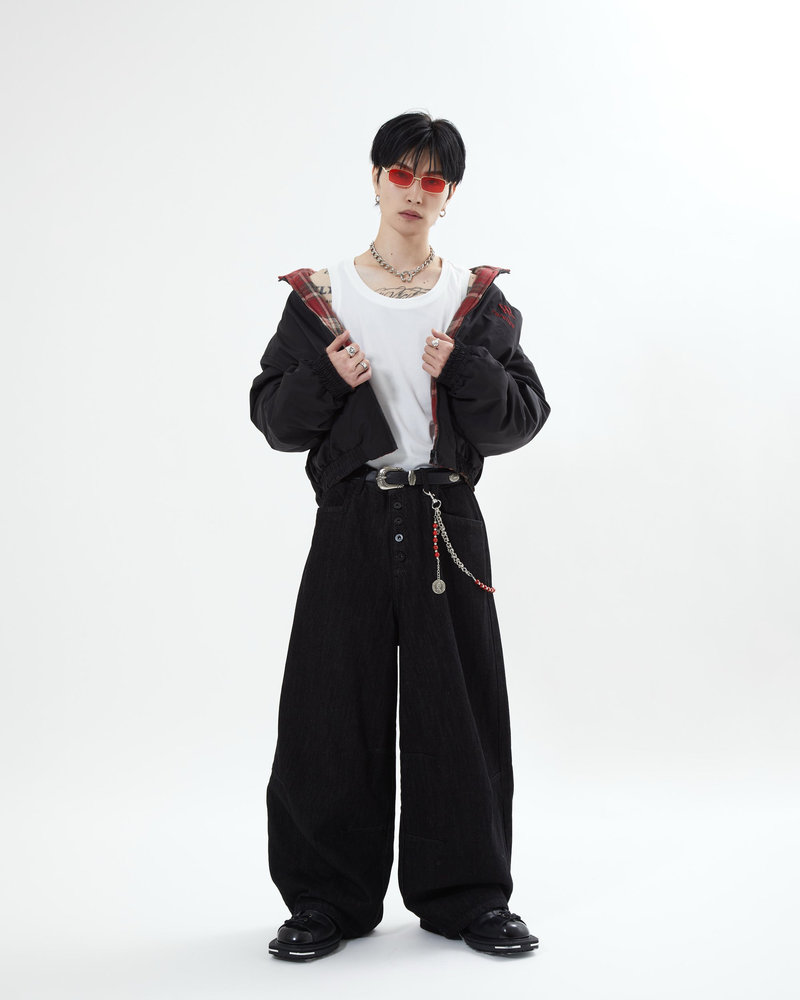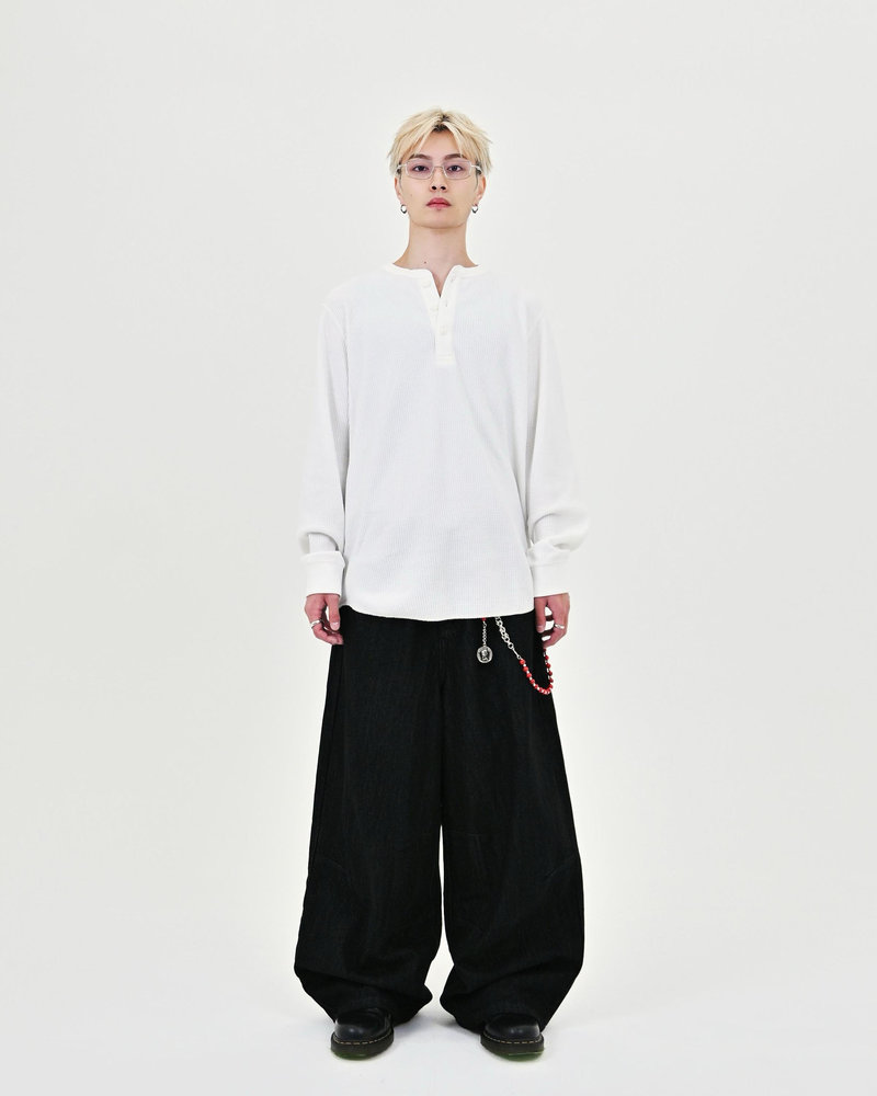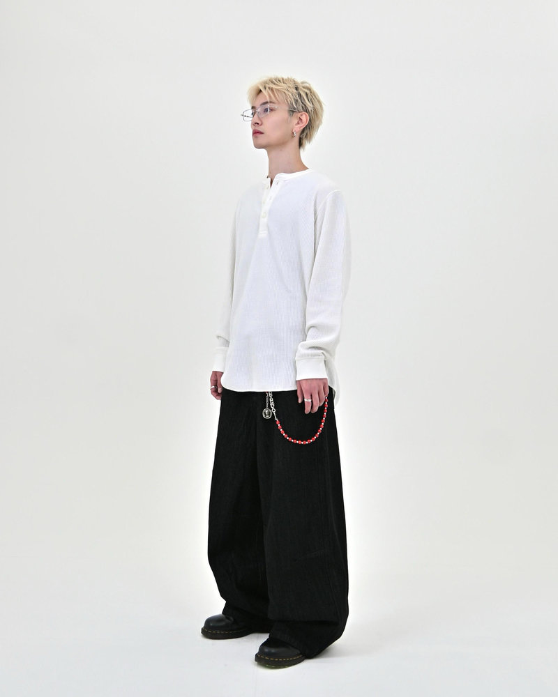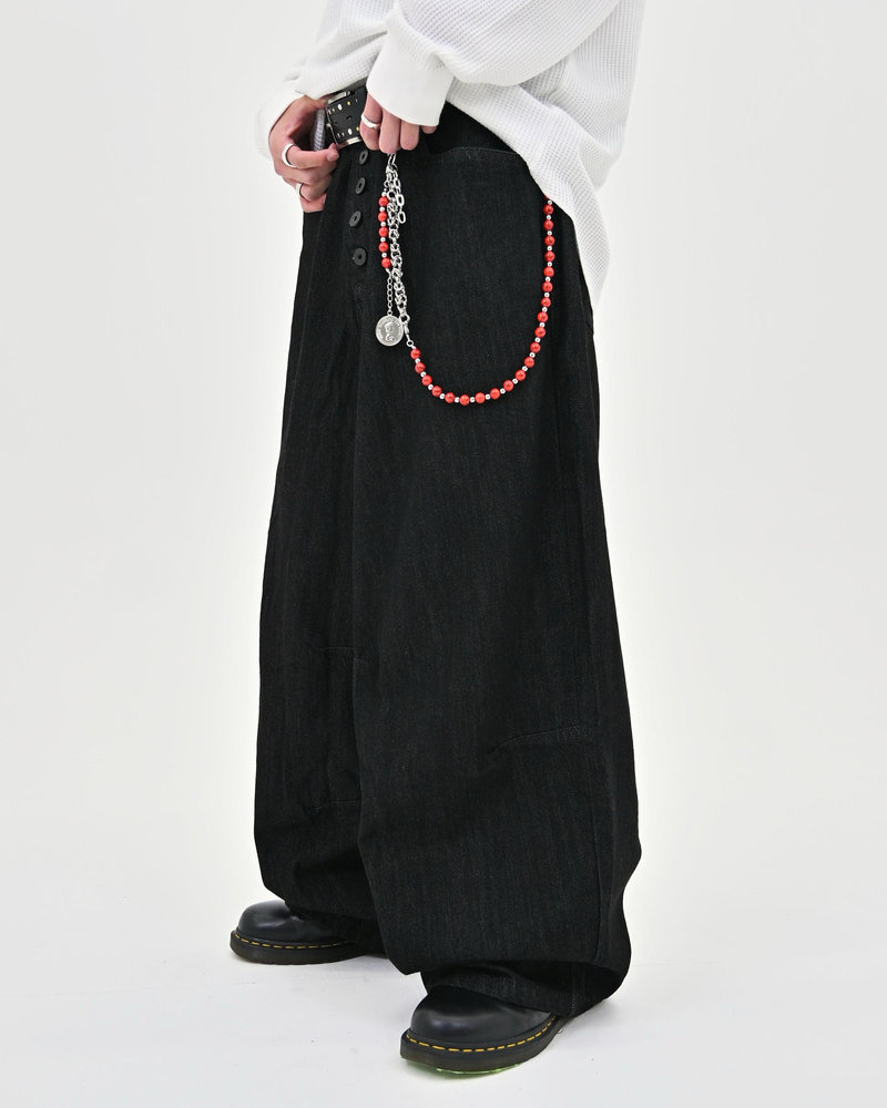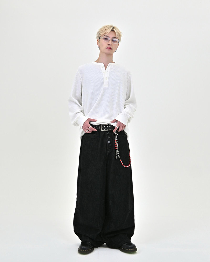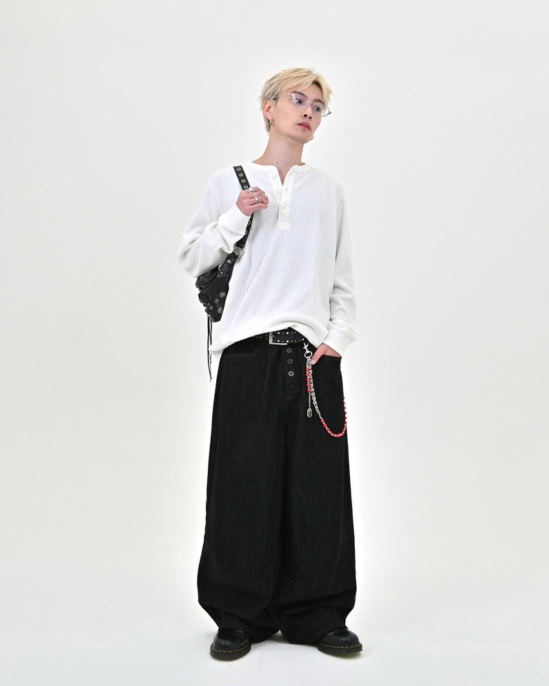トレンドのボタンフライデニムをあえてボタンまでブラックにすることで、唯一無二のデニムに仕上がりました。