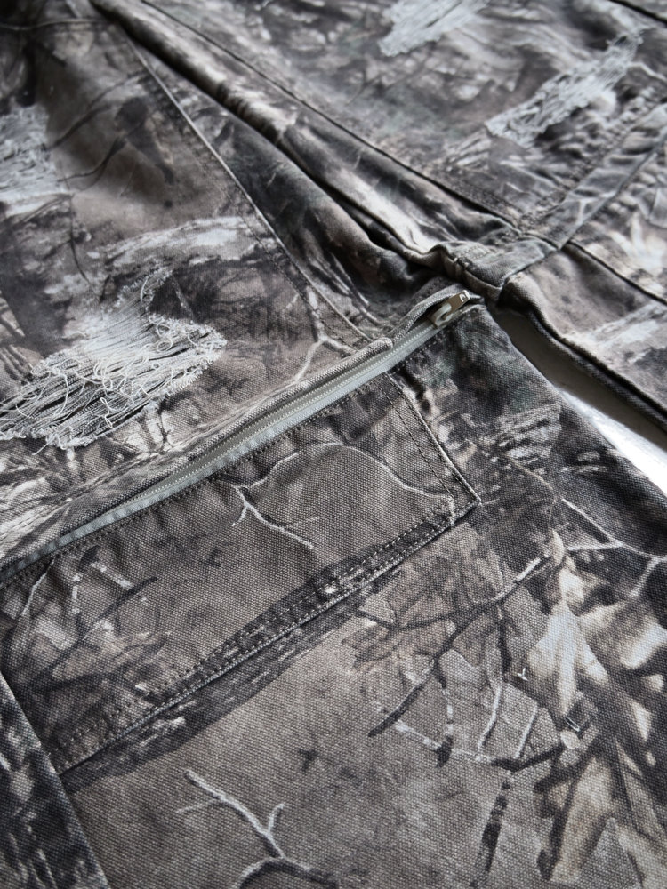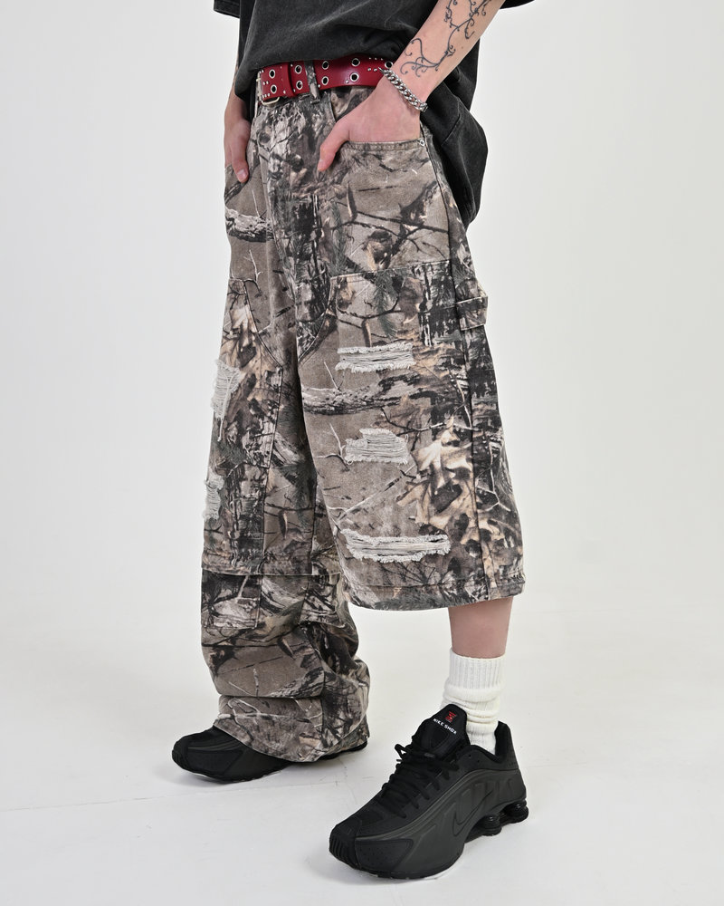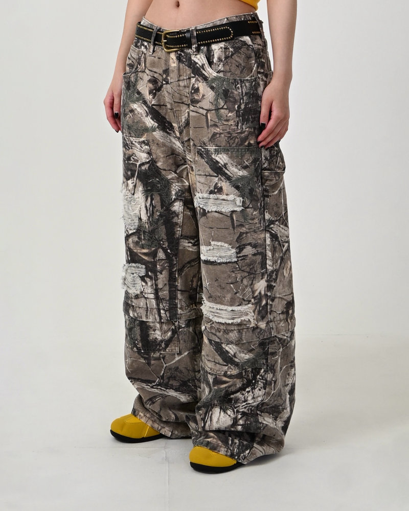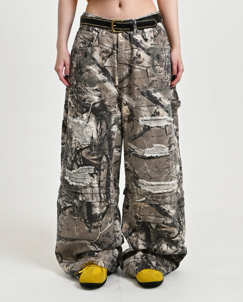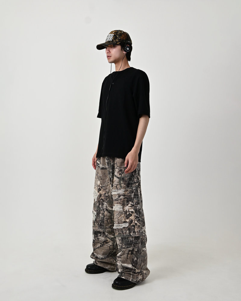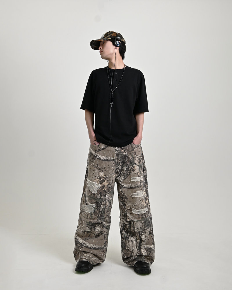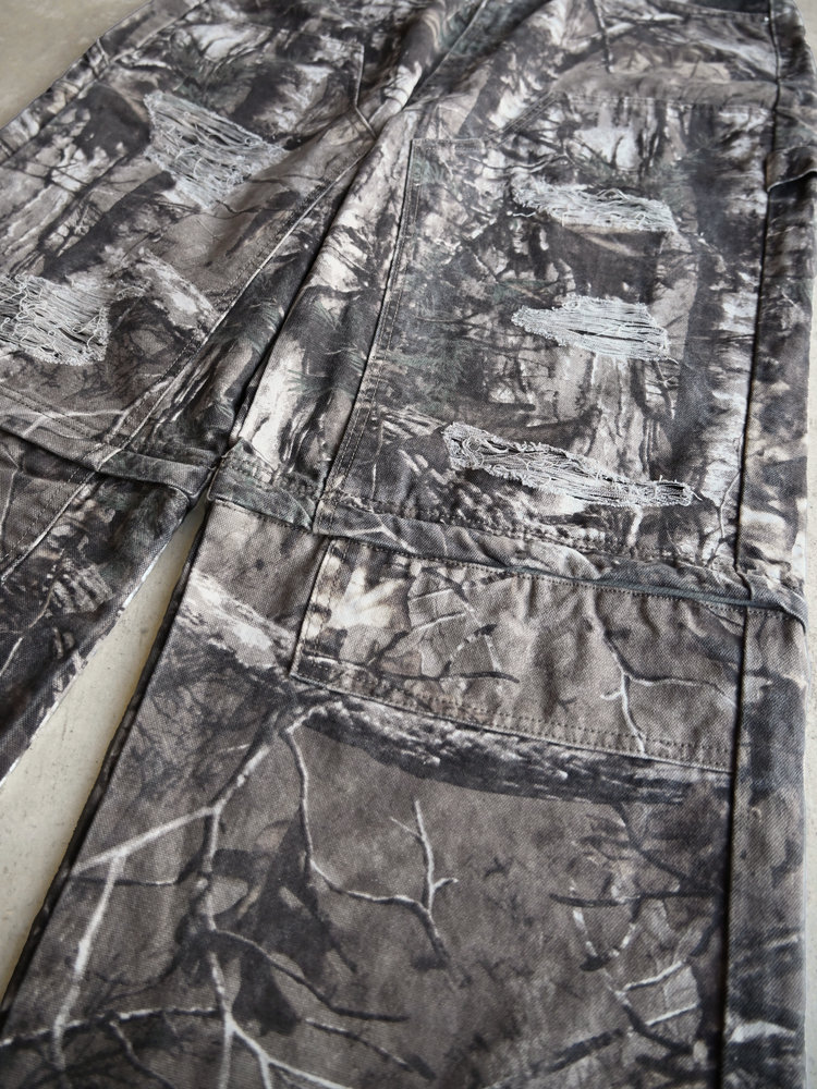 トレンドのリアルツリー柄に、地底人ONLINEらしいダメージ加工をプラス。ヴィンテージ感のある風合いが、シンプルなトップスと合わせるだけでも”こなれた”雰囲気を演出。