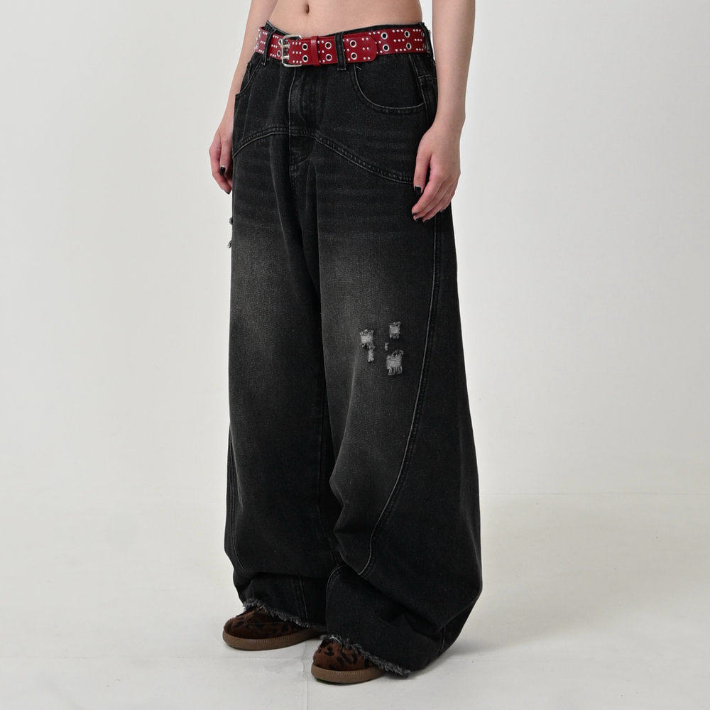 裾にかけてカーブしているサイドシームがスタイルアップを叶えてくれる。さらにさりげないダメージ加工で、一癖ありながらも幅広いコーデに馴染む万能デザイン。