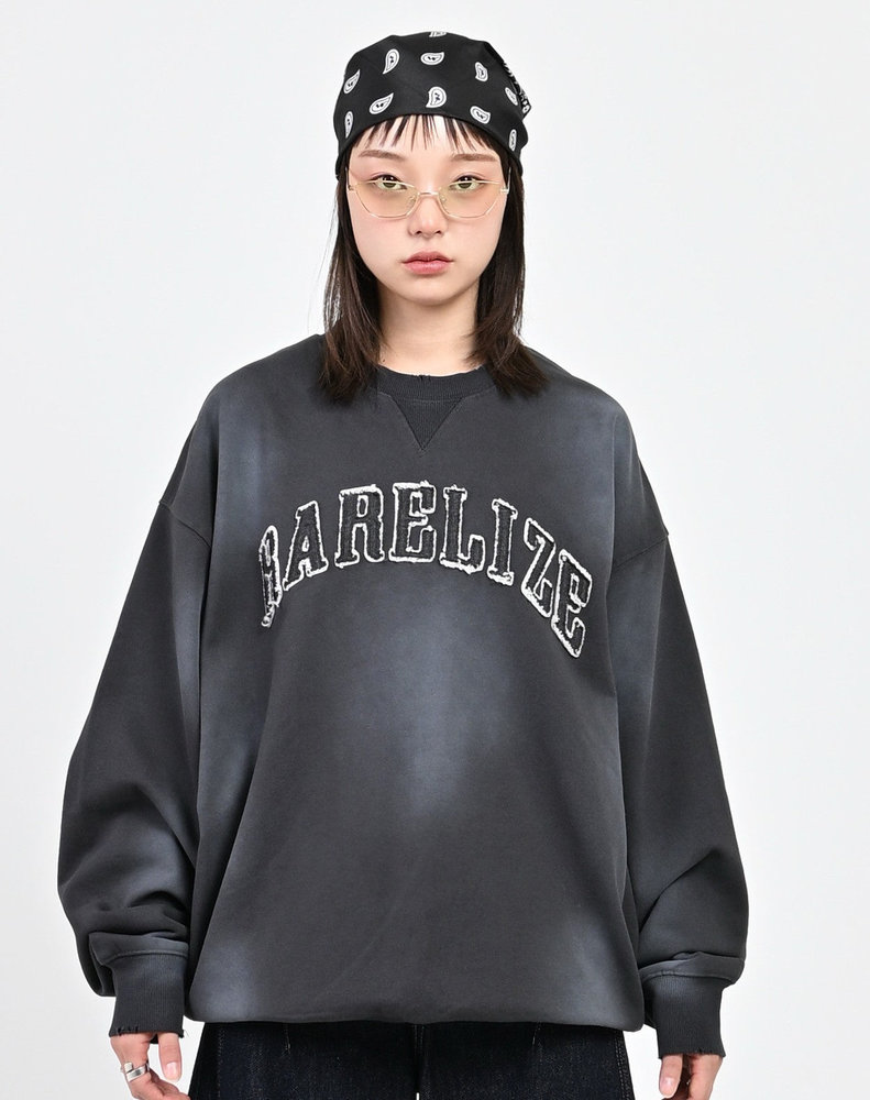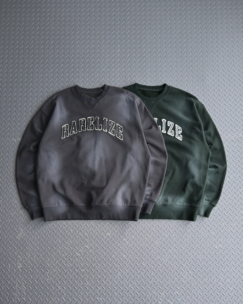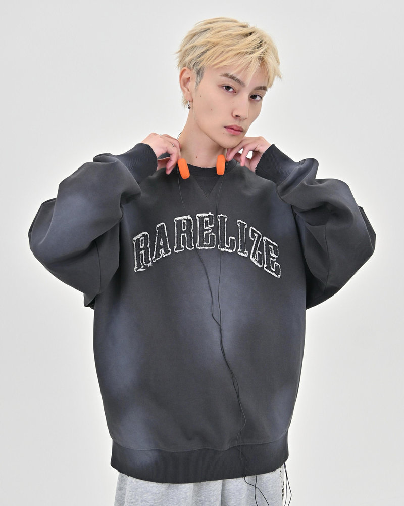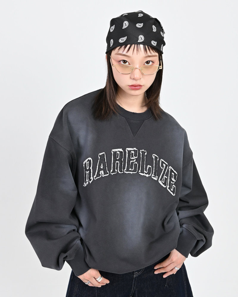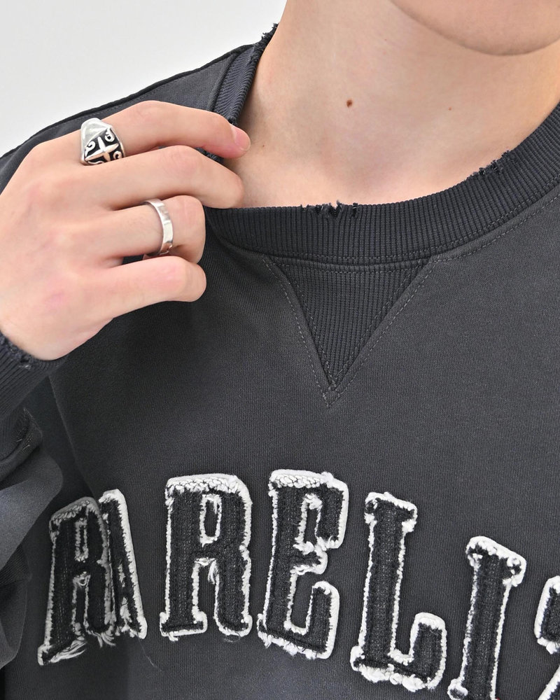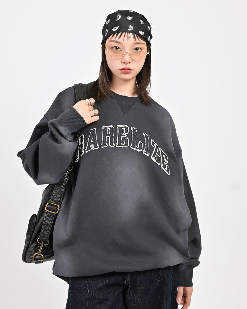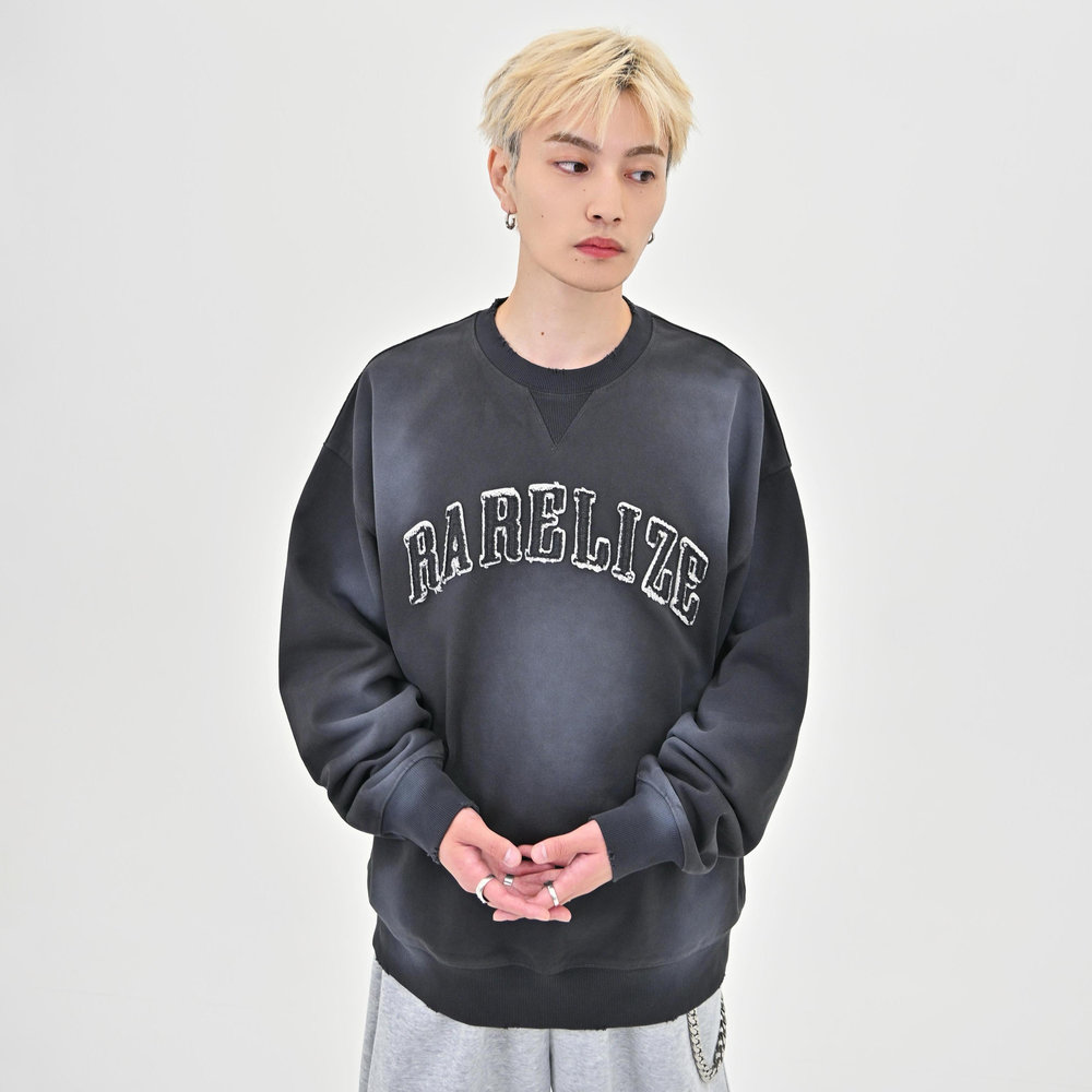トレンド感たっぷりのウォッシュ加工を施したスウェットに、立体感のあるアップリケロゴをオン。
