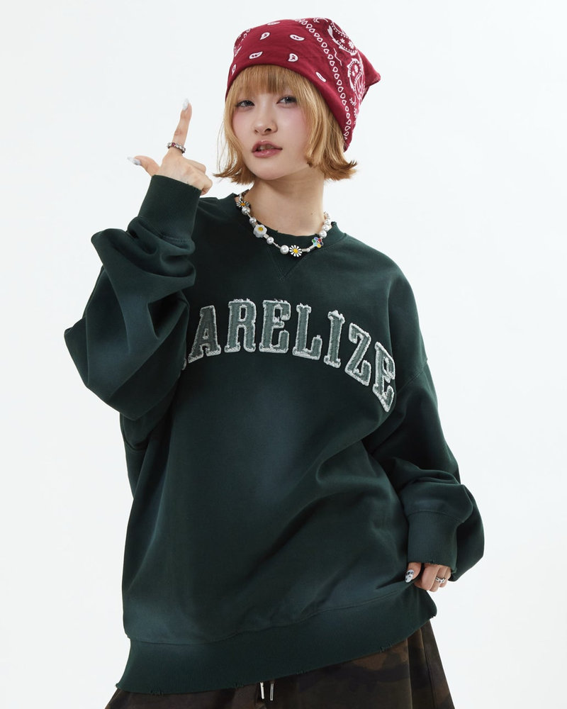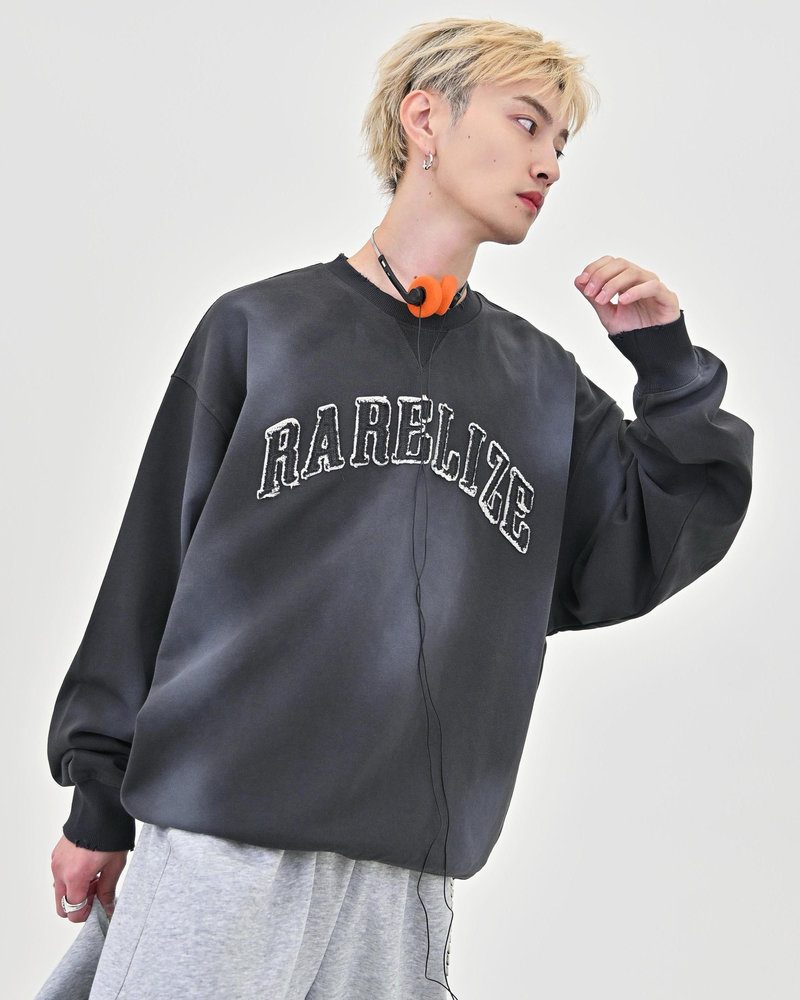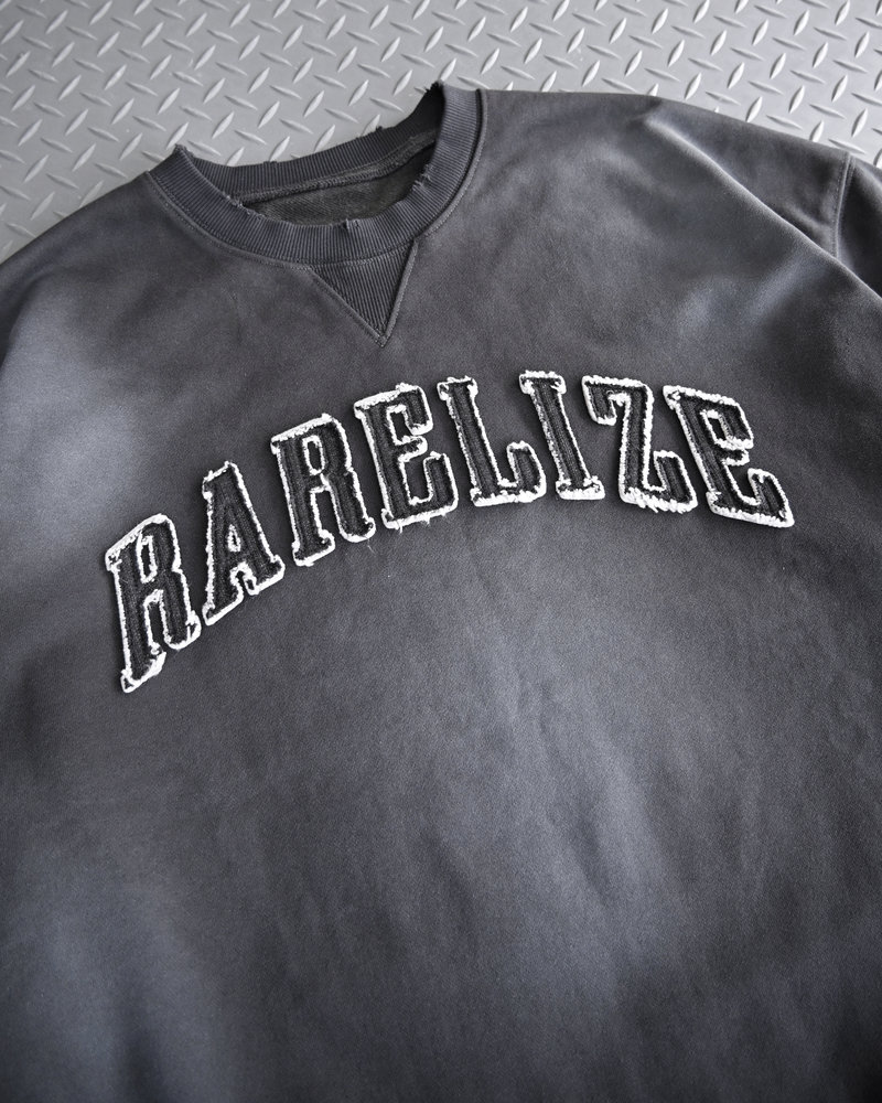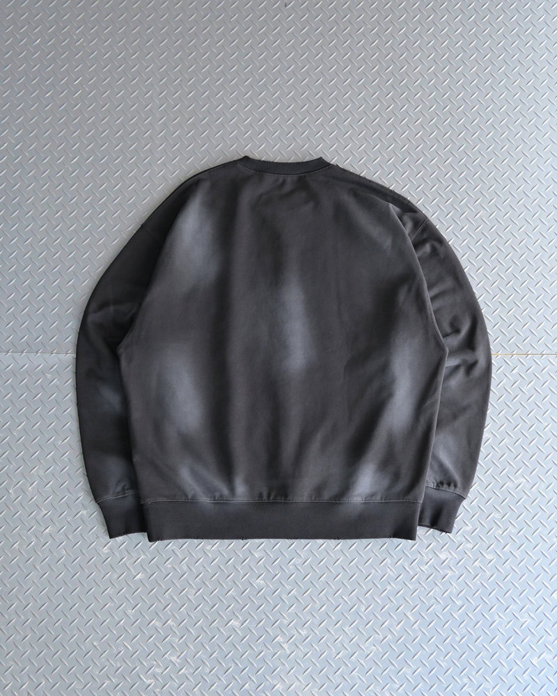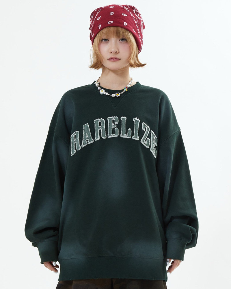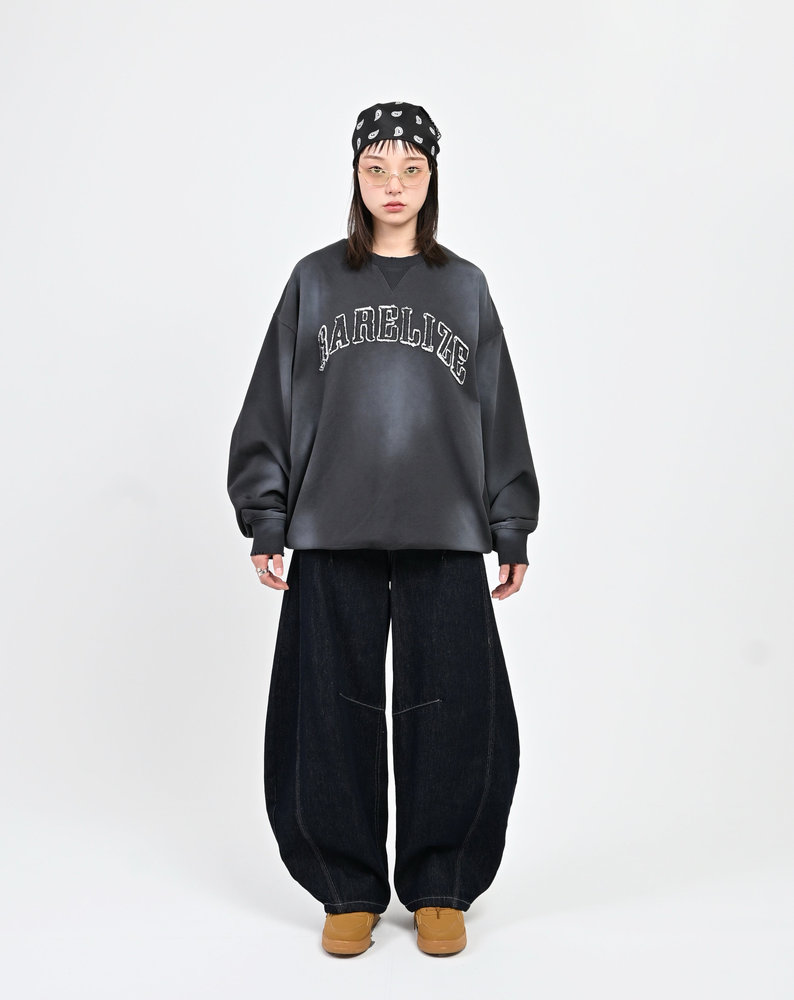 トレンド感たっぷりのウォッシュ加工を施したスウェットに、立体感のあるアップリケロゴをオン。