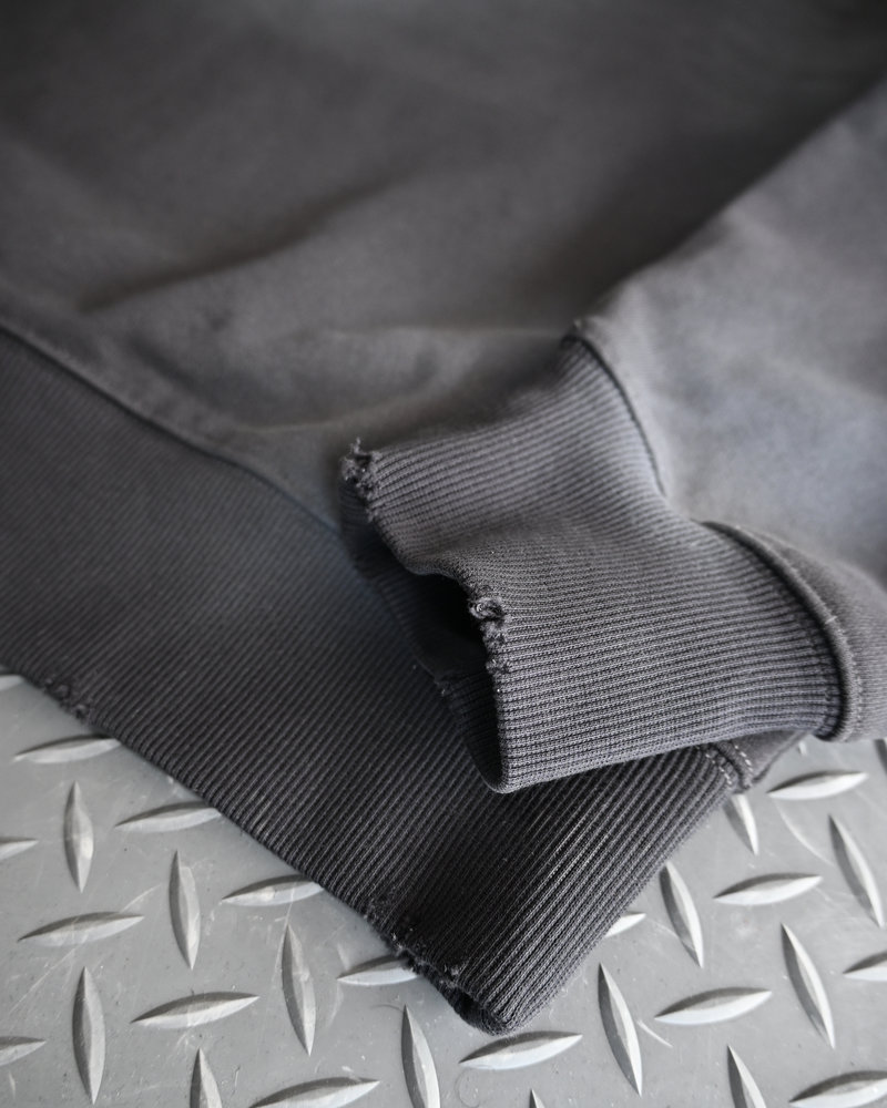 裾や袖にはさりげないダメージ加工を加え、ヴィンテージライクな雰囲気を演出しています。