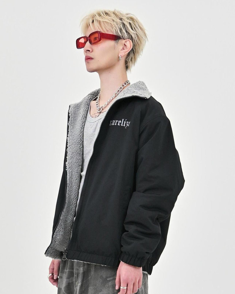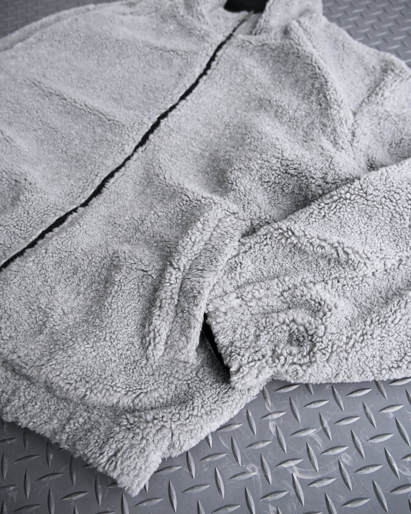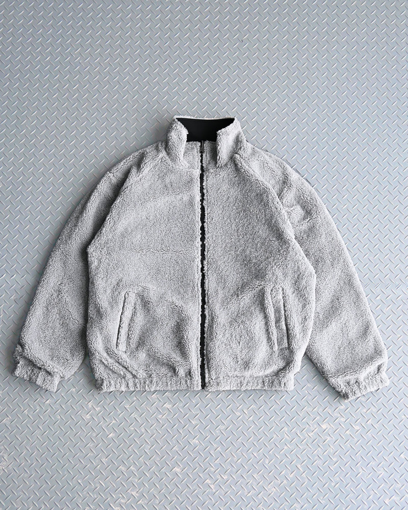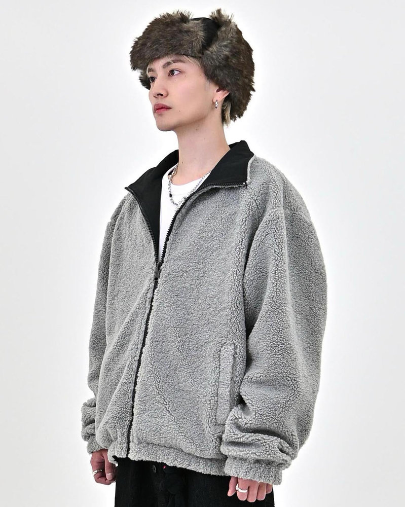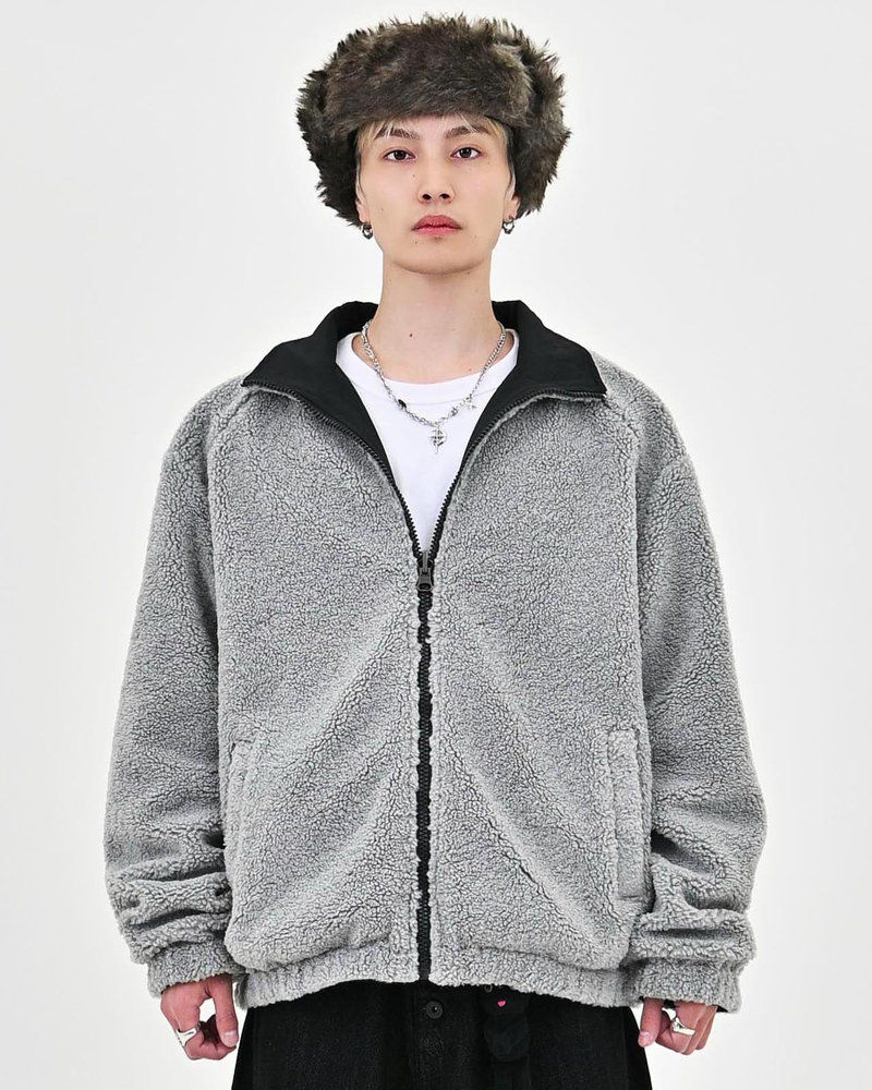 両面での着用を前提に設計され、ブラックのナイロン面とグレーのフリース面、どちらも着回し力抜群。