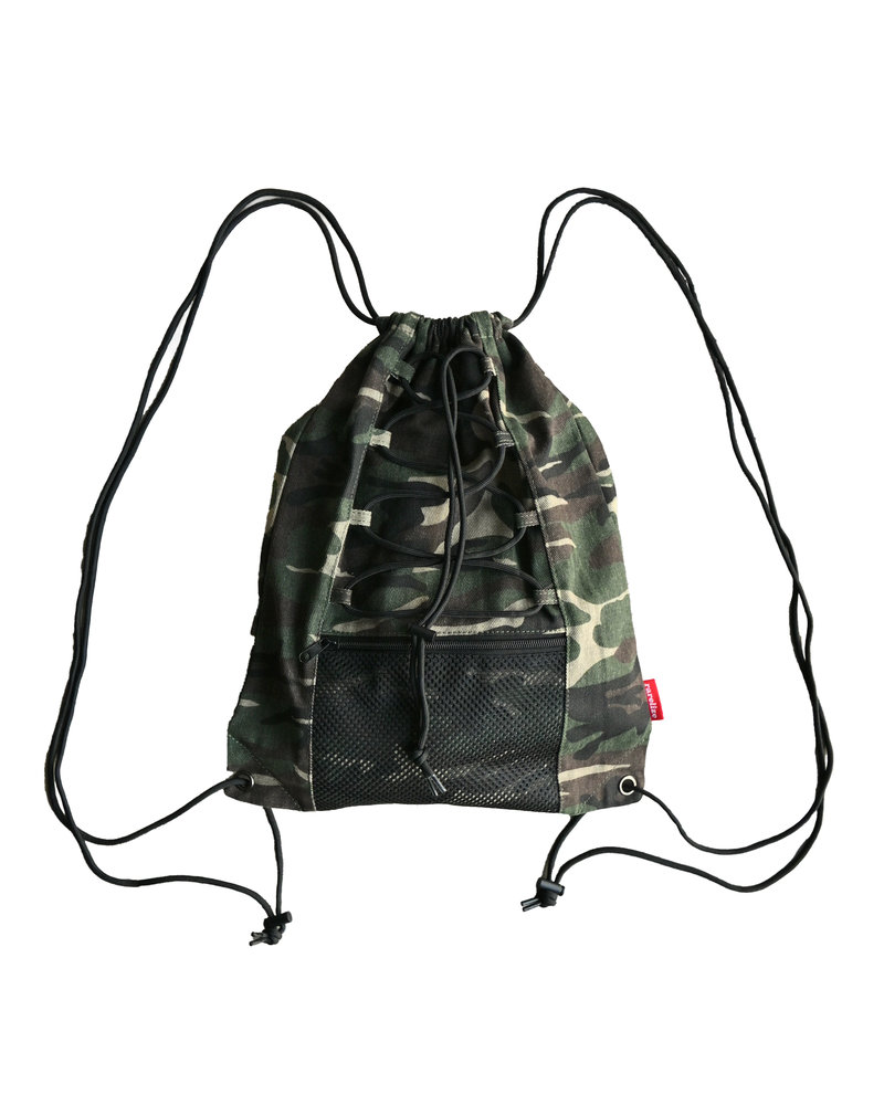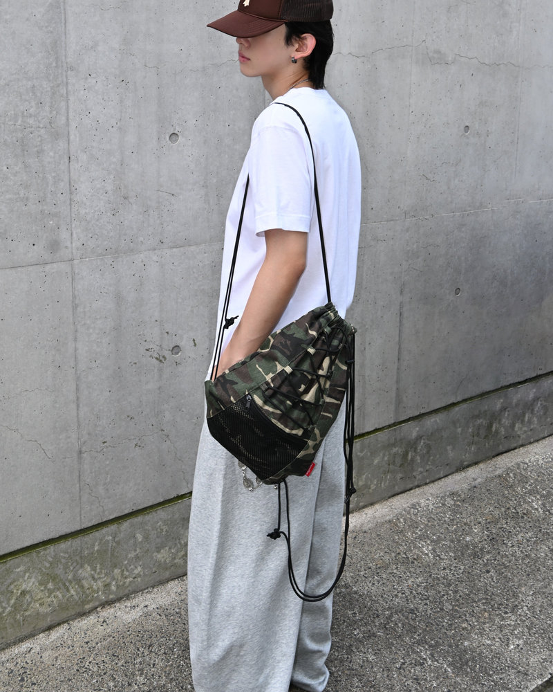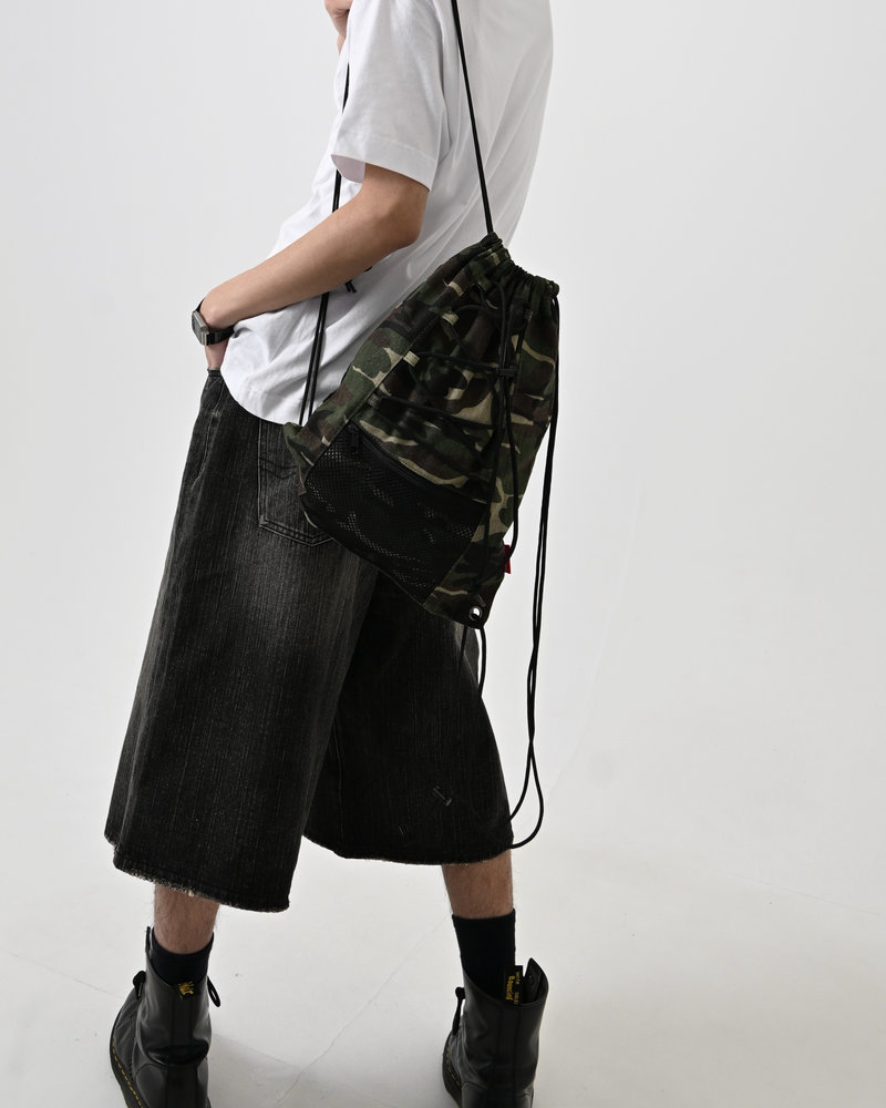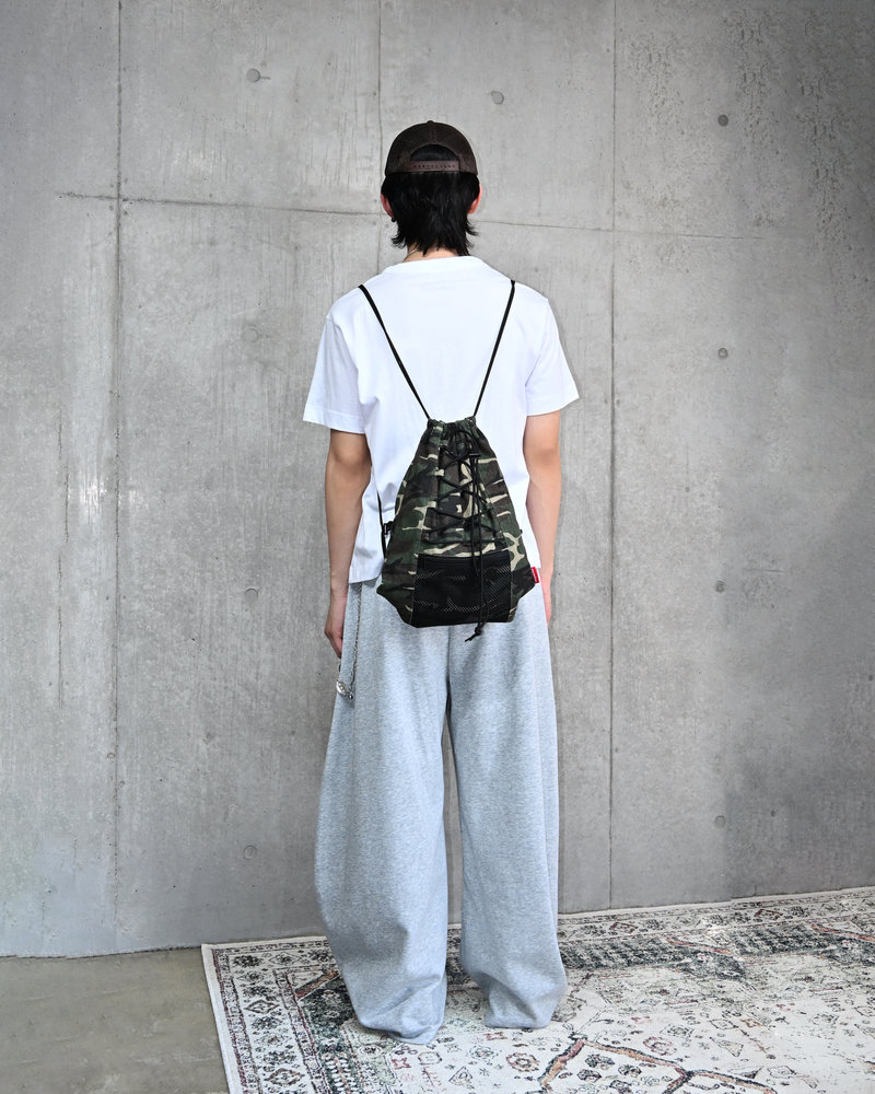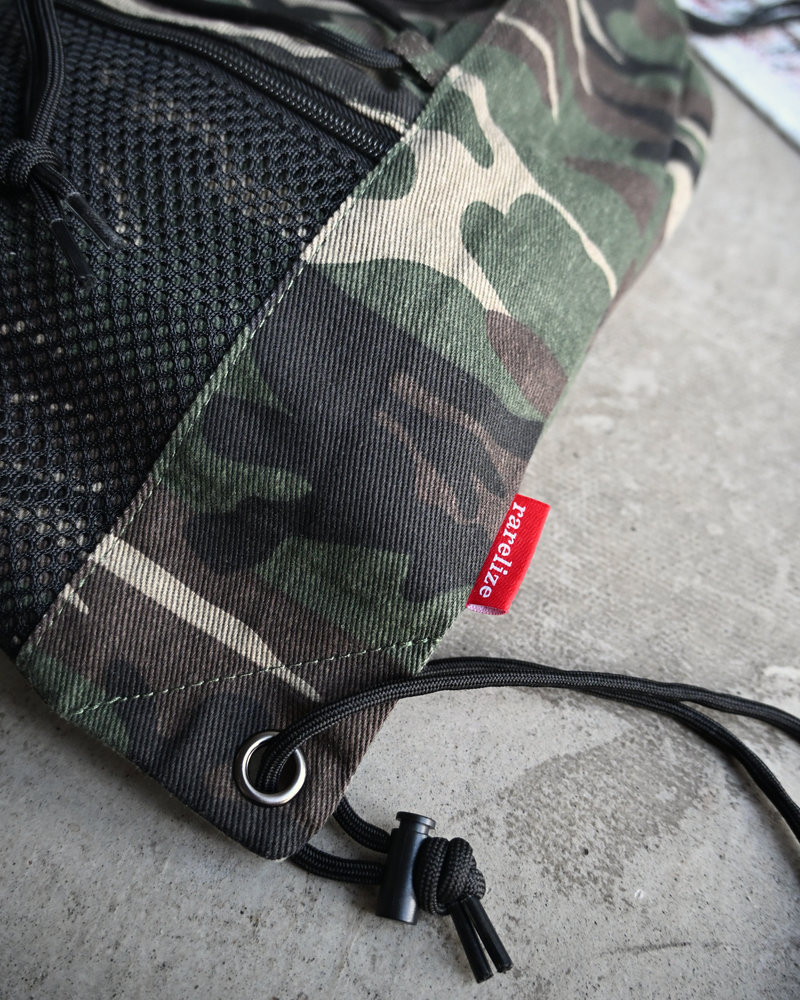 アクセントには、rarelizeの赤タグをワンポイントで。迷彩の中でさりげなく光る“差し色”が、ありきたりなナップザックとの違いを演出。