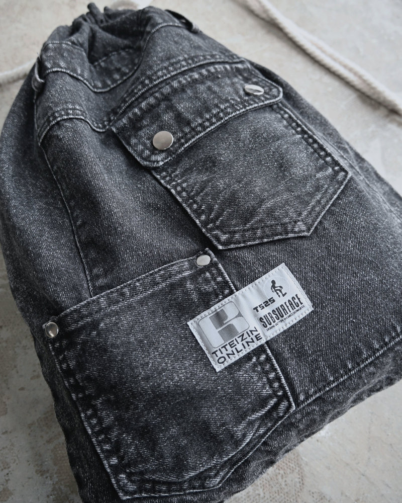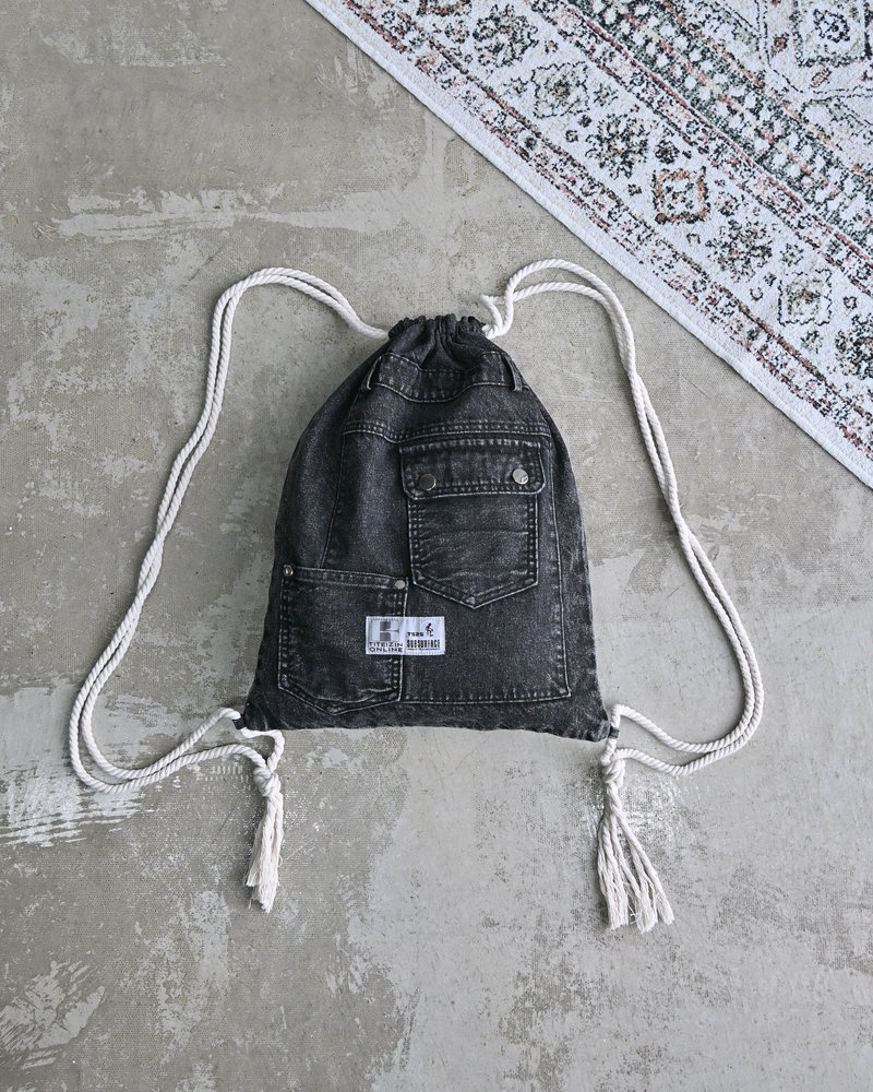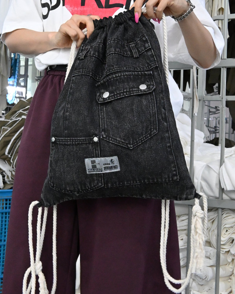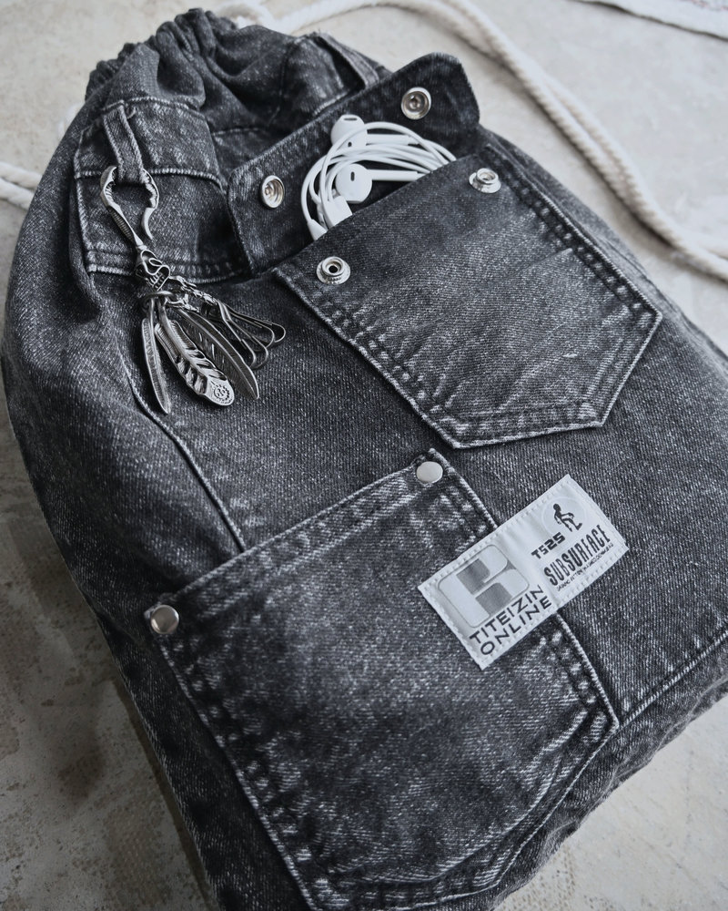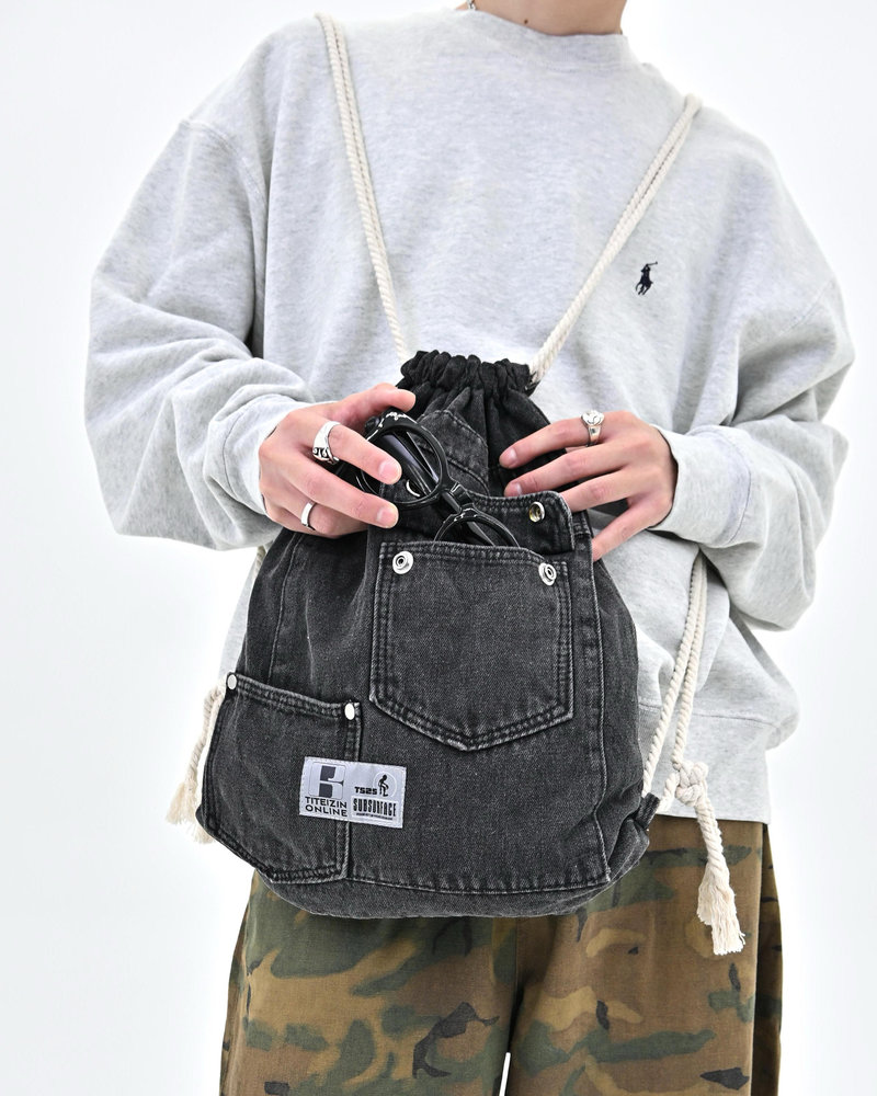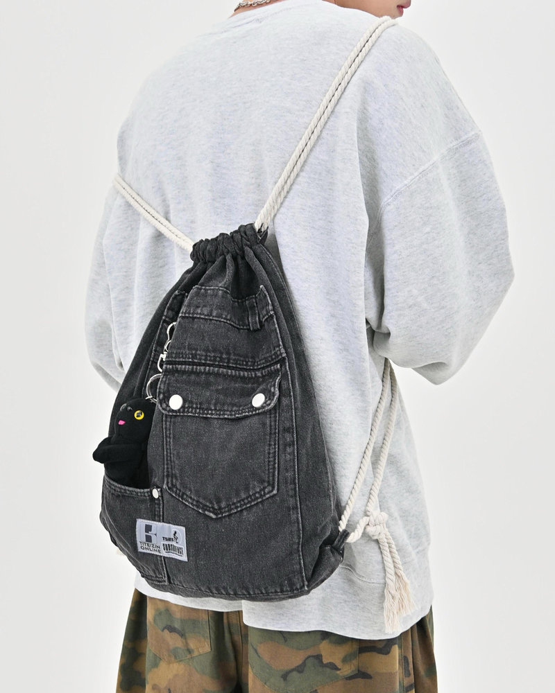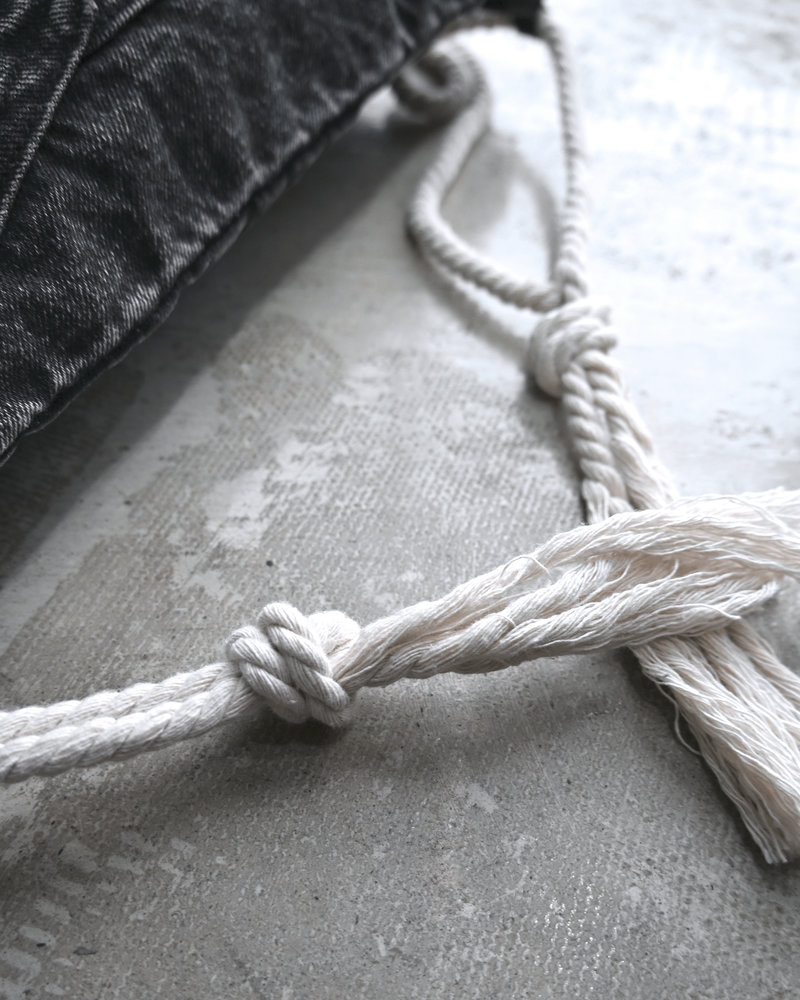 無骨なブラックデニムに、柔らかさを添えるベージュのドローコード。素材と色のコントラストが、スタイリングに深みをプラス