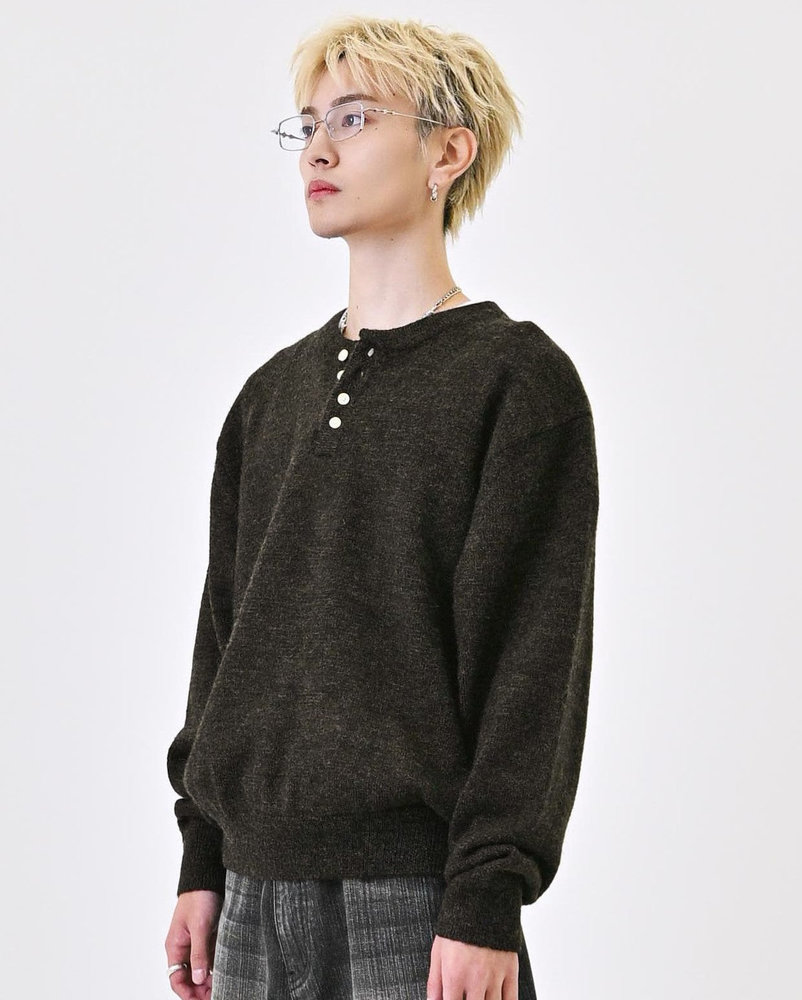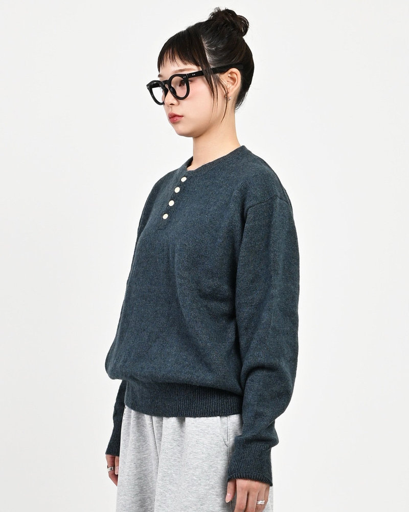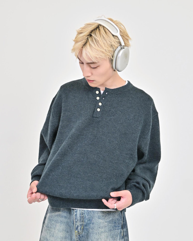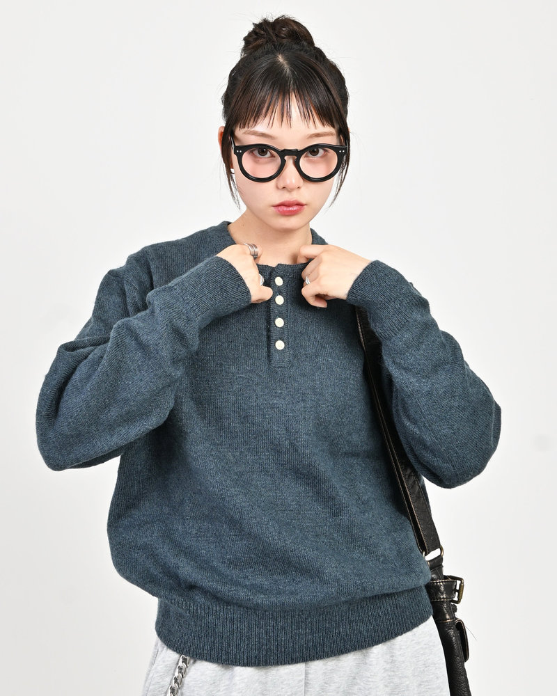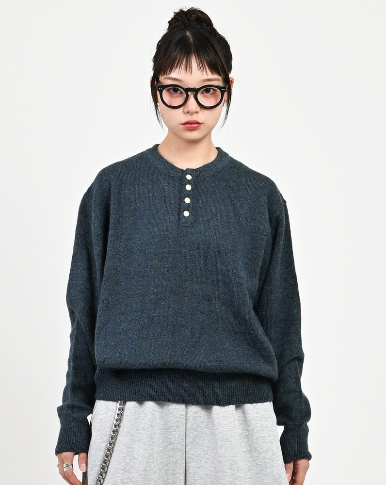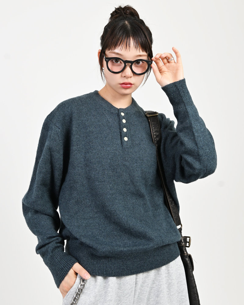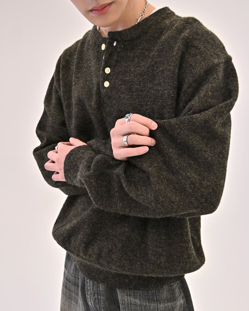 2色の糸を組み合わせたメランジニットに、トレンドのヘンリーネックデザインをプラス。