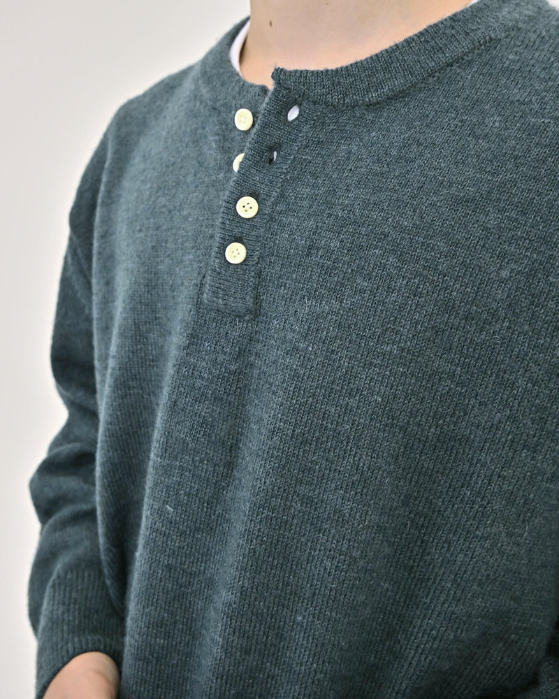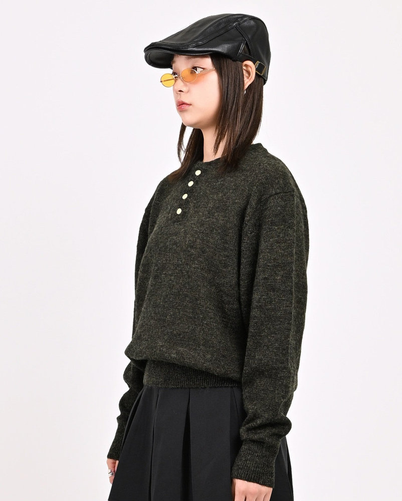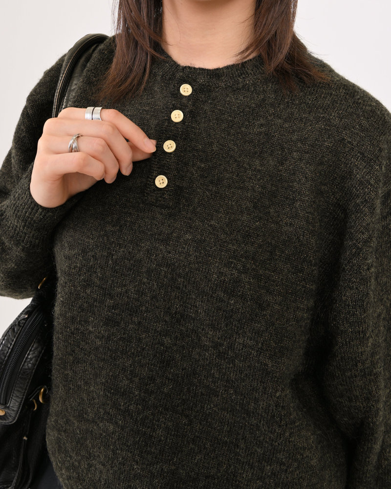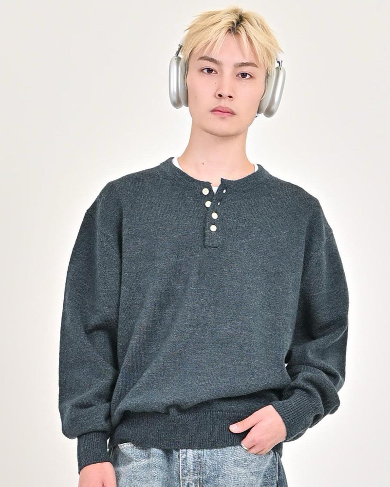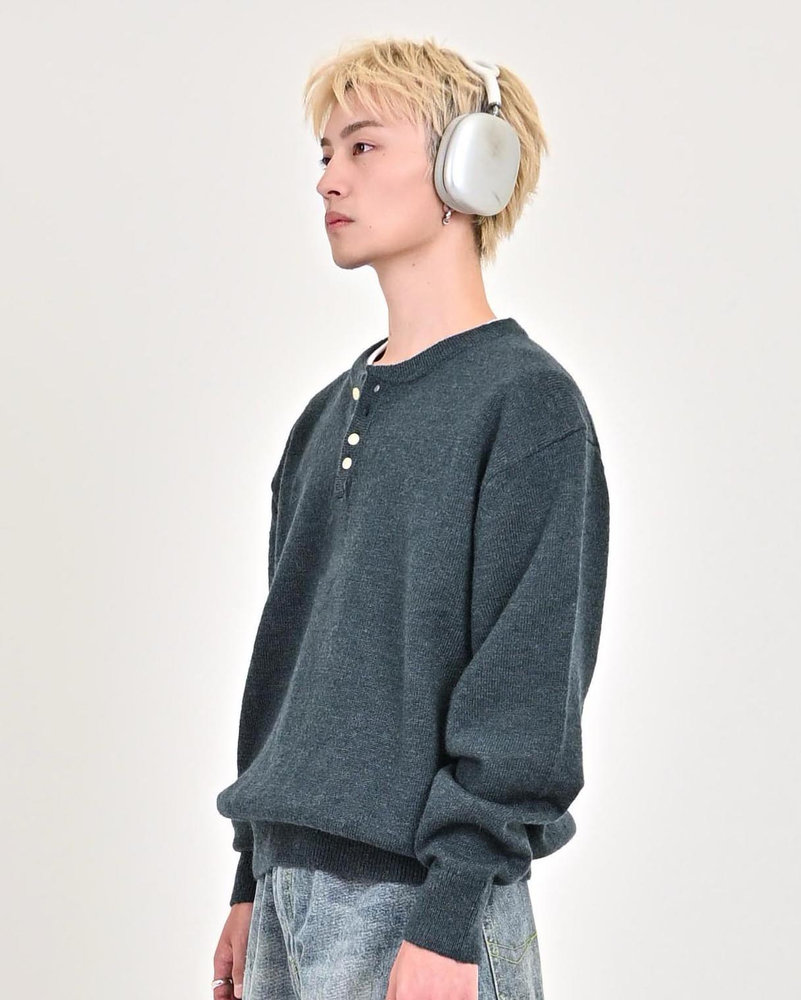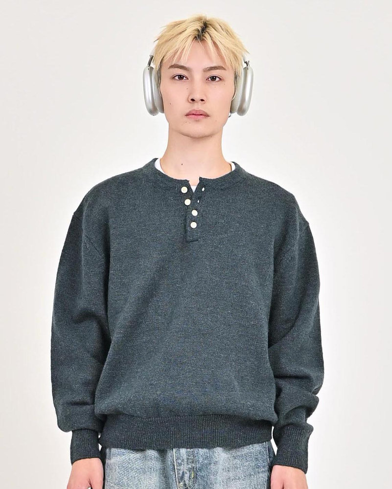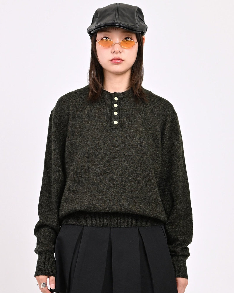 2色の糸を組み合わせたメランジニットに、トレンドのヘンリーネックデザインをプラス。