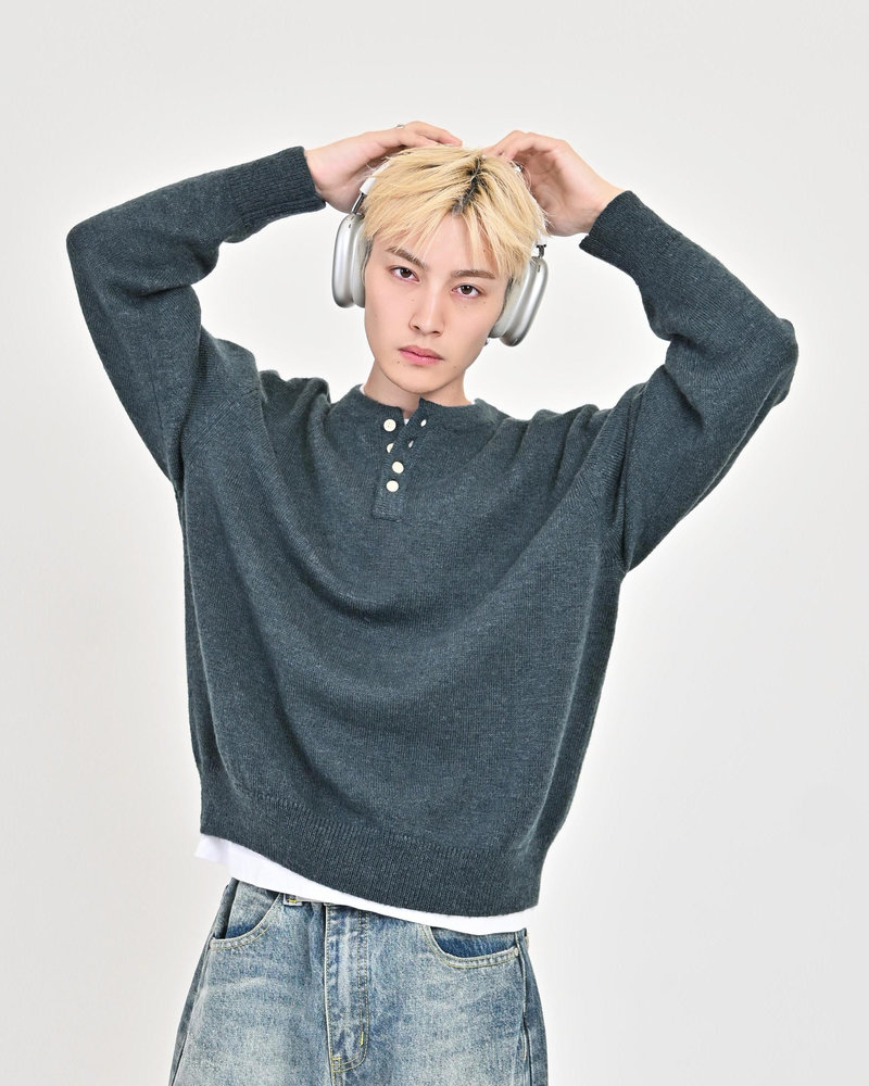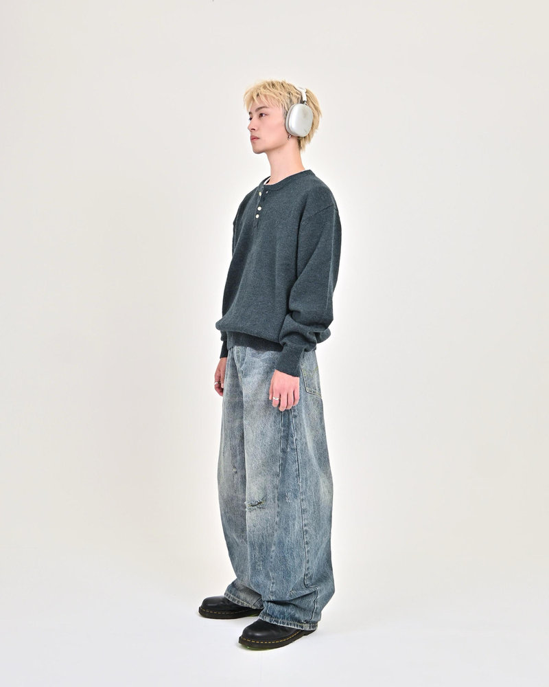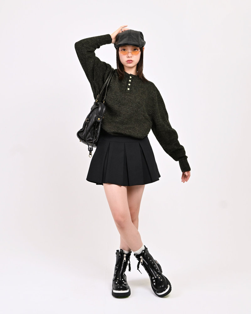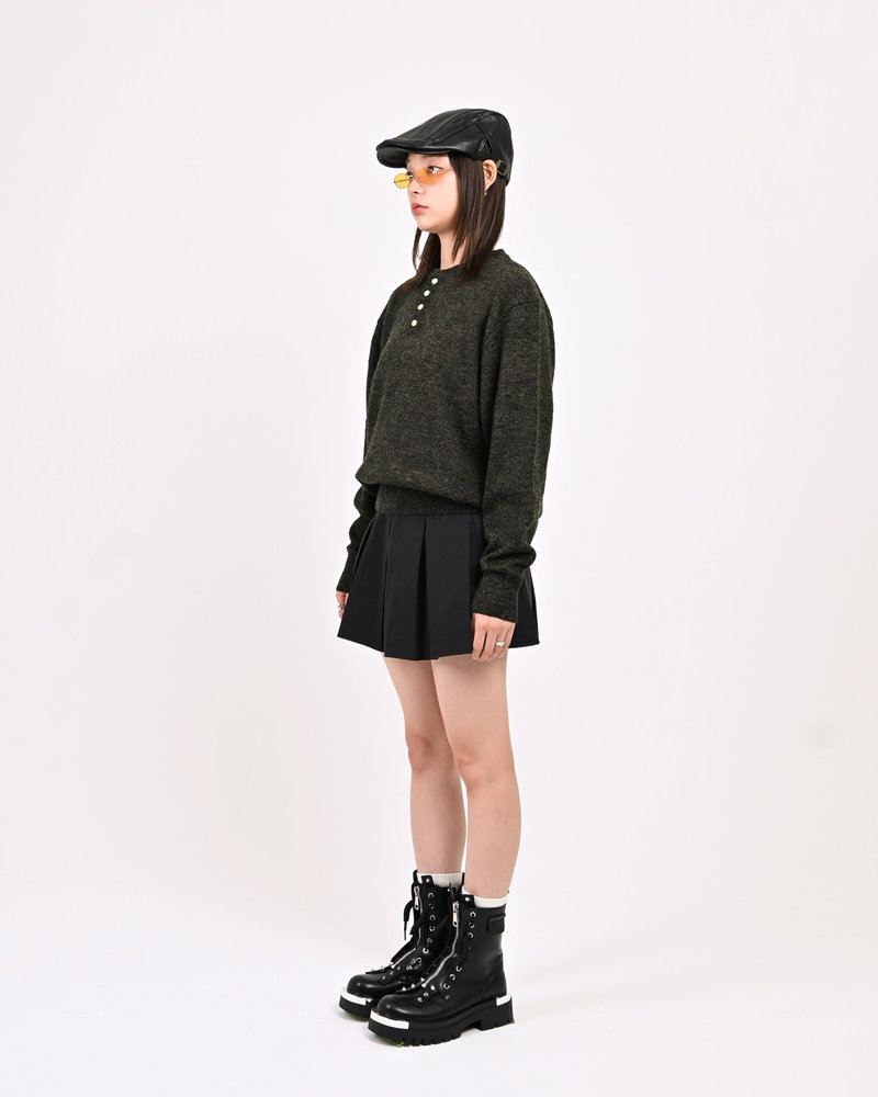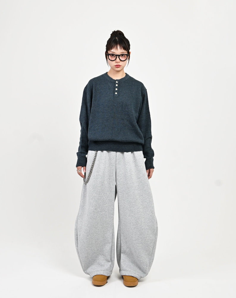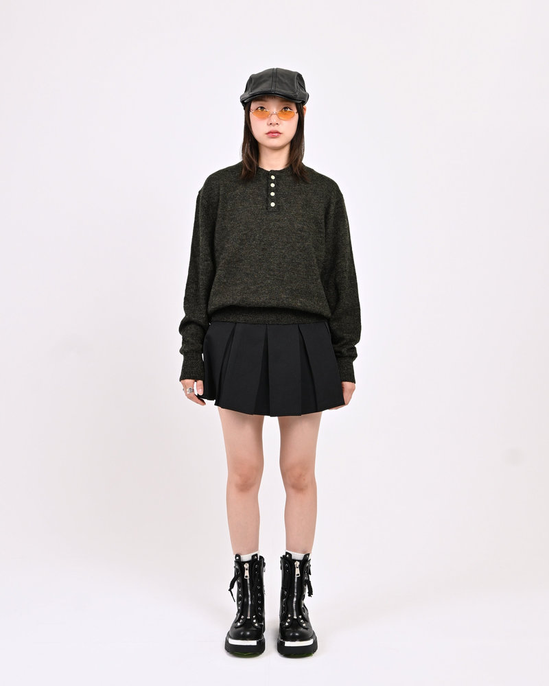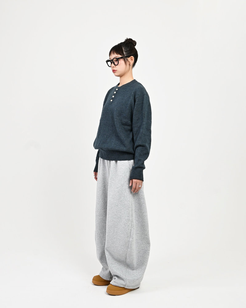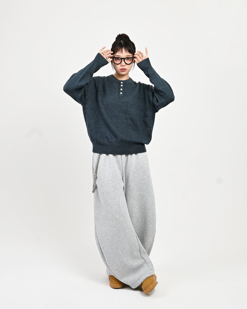2色の糸を組み合わせたメランジニットに、トレンドのヘンリーネックデザインをプラス。