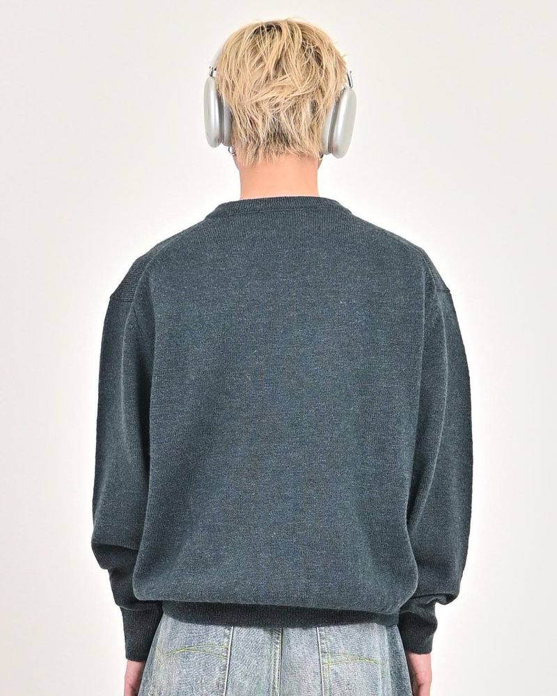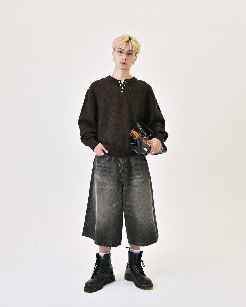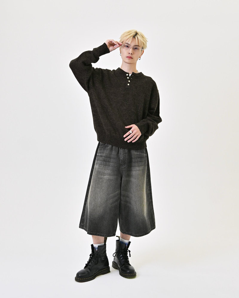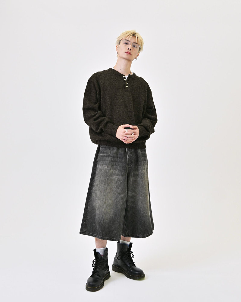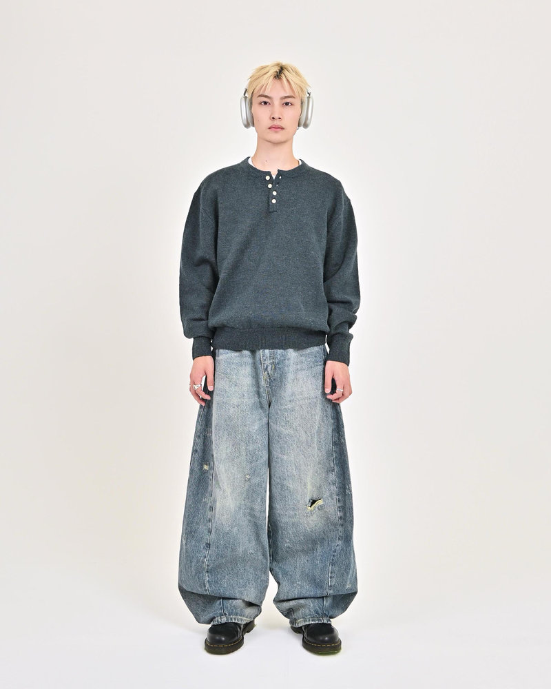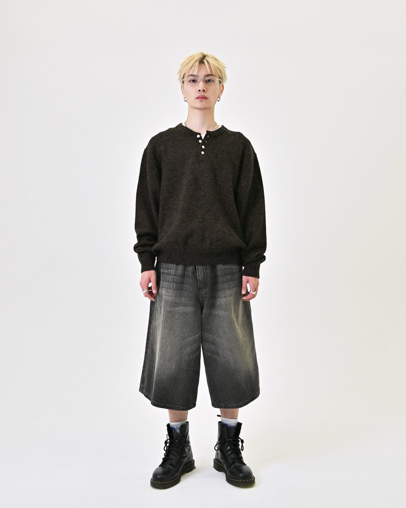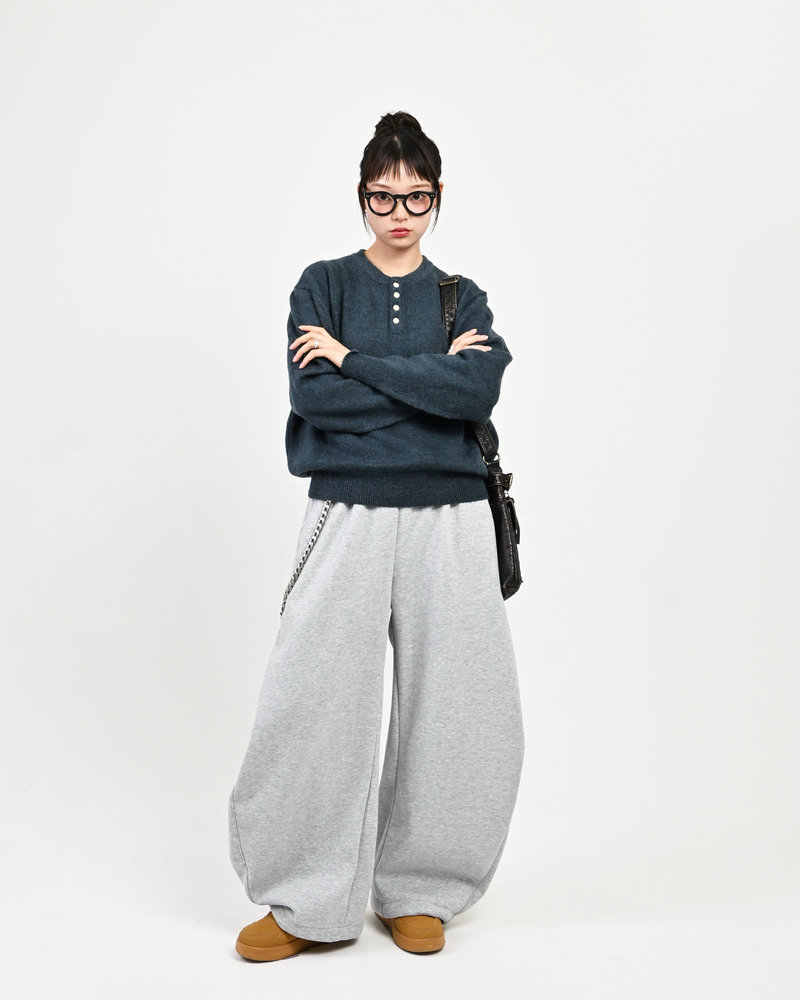 2色の糸を組み合わせたメランジニットに、トレンドのヘンリーネックデザインをプラス。
